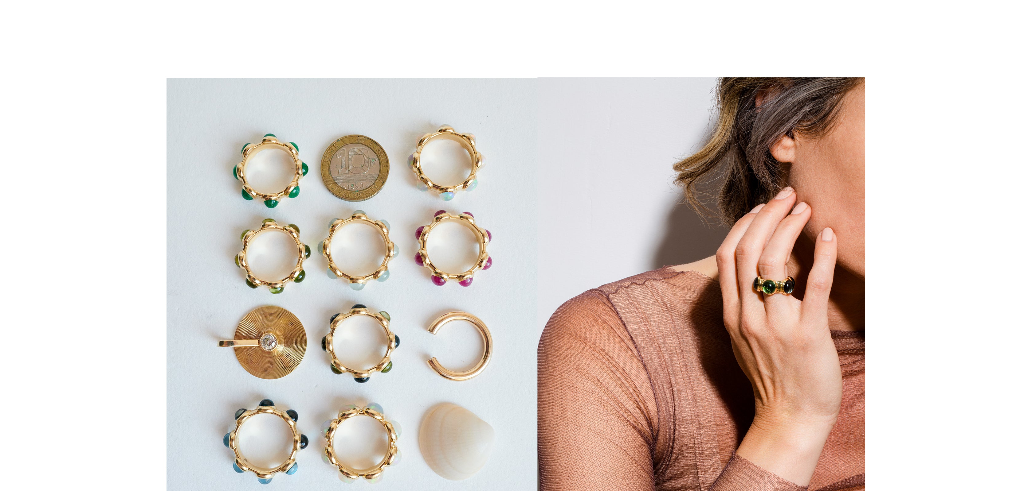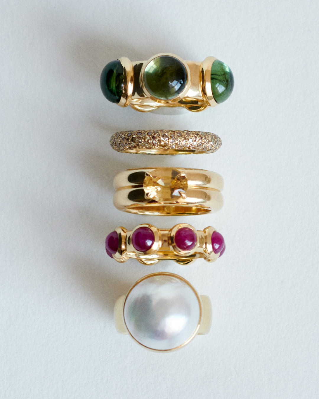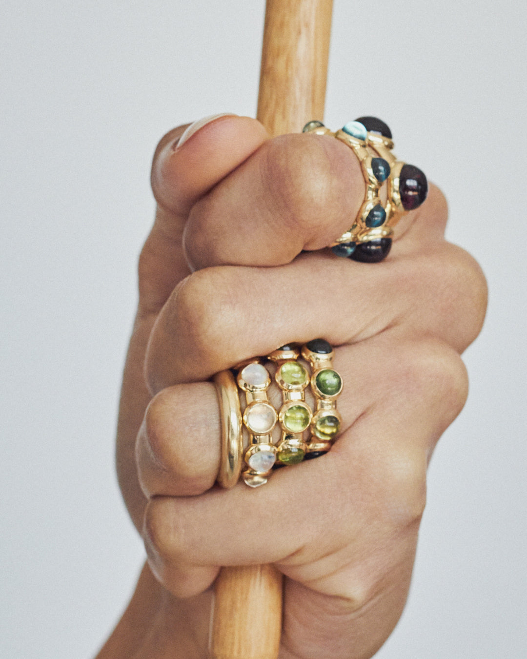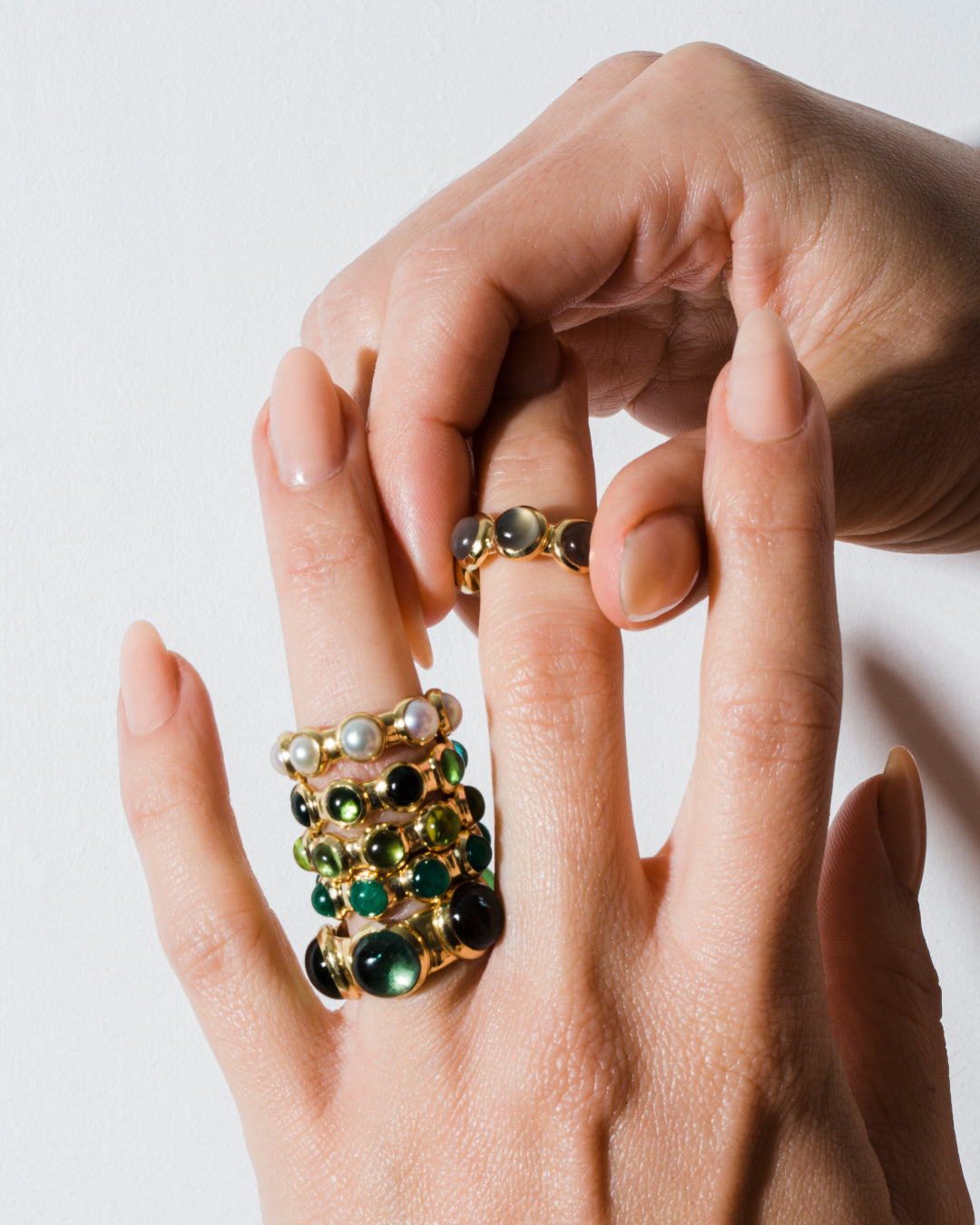 The Vic Collection, named in honor of Jade’s father, embodies the perfect balance of hard and smooth — combining lush, rounded cabochon gemstones with solid 18 karat gold. With stones ranging from opaque to iridescent to precious, there’s a gem to reflect every style, mood, and milestone. Designed to seamlessly interlock in small, medium, and large sizes, Vic stacks elevate the art of stacking — inviting you to layer, personalize, and define your own look. Effortless yet bold, these rings claim their place as your cool, chic everyday go-to — the kind of piece you never want to take off.