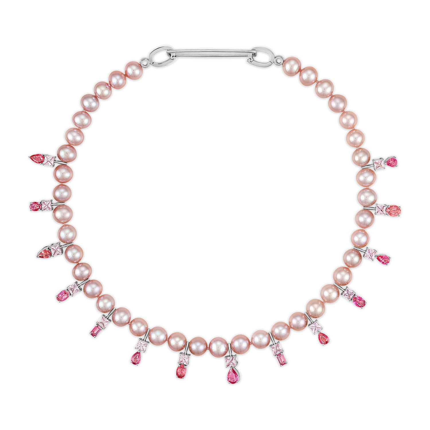 The sapphires—totaling 15.44 carats—vary in cut and saturation, from warm apricot to a barely-there blush. Their precise asymmetry plays against the organic luster of 8–9mm pearls, creating rhythm through contrast. At the back, a custom platinum extender bar allows the piece to be worn as a choker or collar, depending on your mood or neckline. Chic on its own, meaningful by nature, and designed to sit close to the heart.