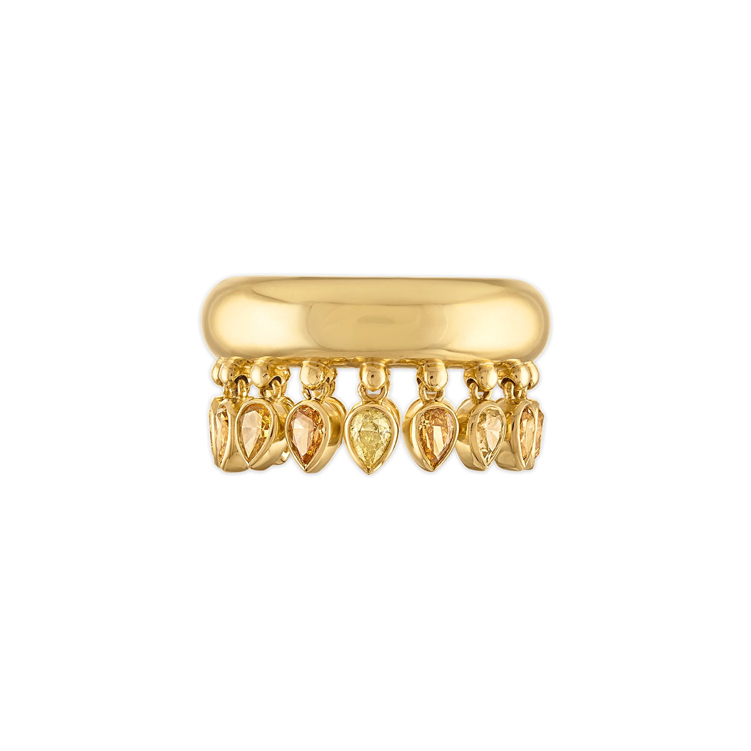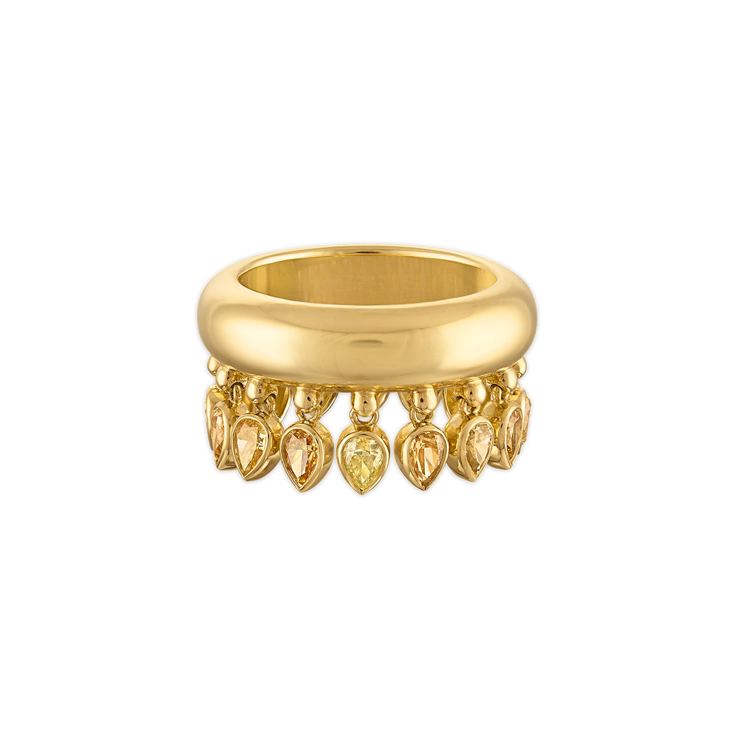 An unexpected rhythm. The Tennessee Drip Ring reimagines our signature diamond fringe with a custom arrangement of varying shapes and gemstones—each one bezel-set to move with subtle, liquid-like motion. Crafted in solid 18-karat yellow gold with a 6mm band, it’s a sculptural take on the Tennessee Collection’s core theme: quiet luxury that moves with you.