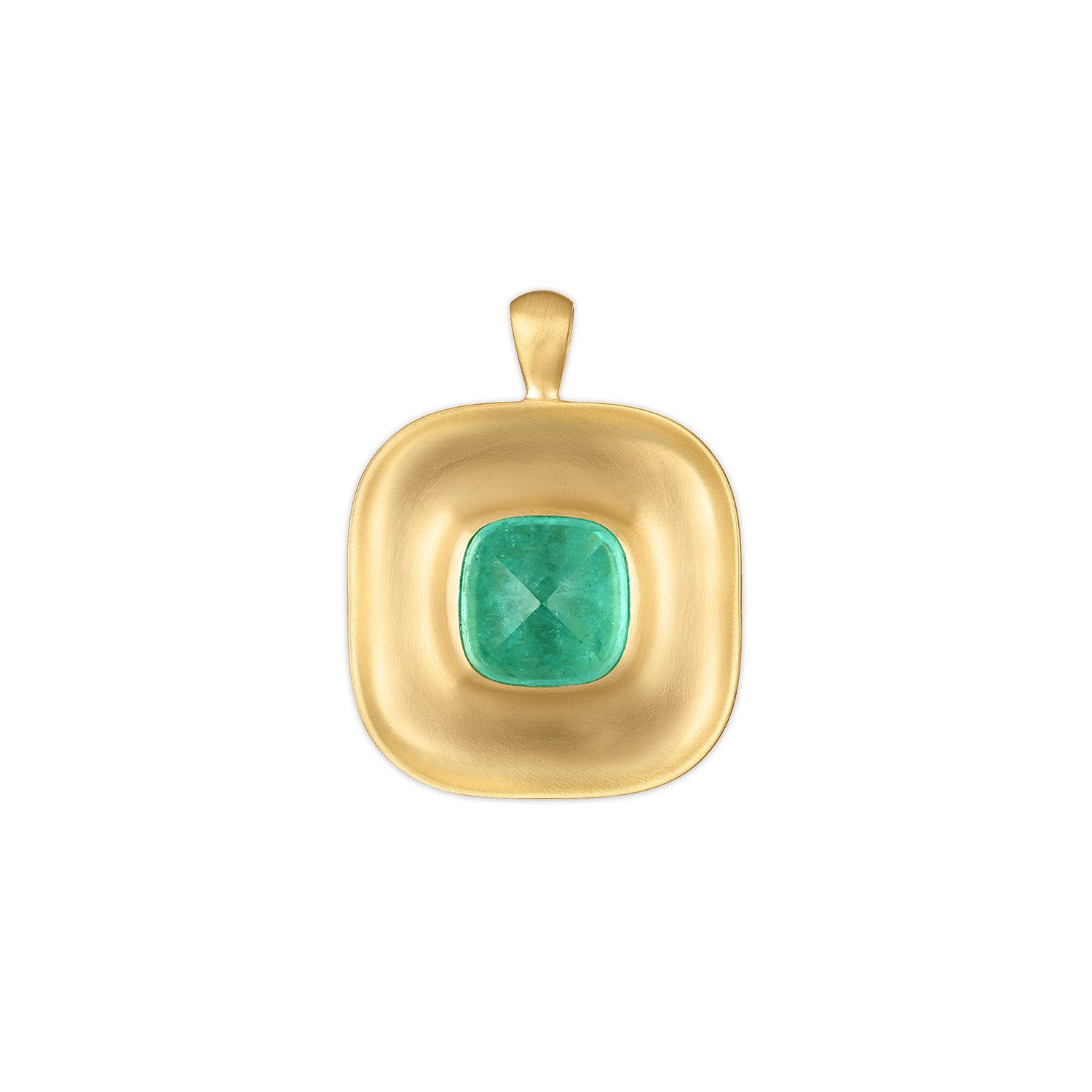 Bold in scale yet restrained in execution, the Gong Pendant is a study in presence. Its architecture is shaped around the gemstone itself—here, a monumental 23.00-carat emerald sugarloaf cabochon, hand-selected for its saturated green hue and richly domed silhouette.