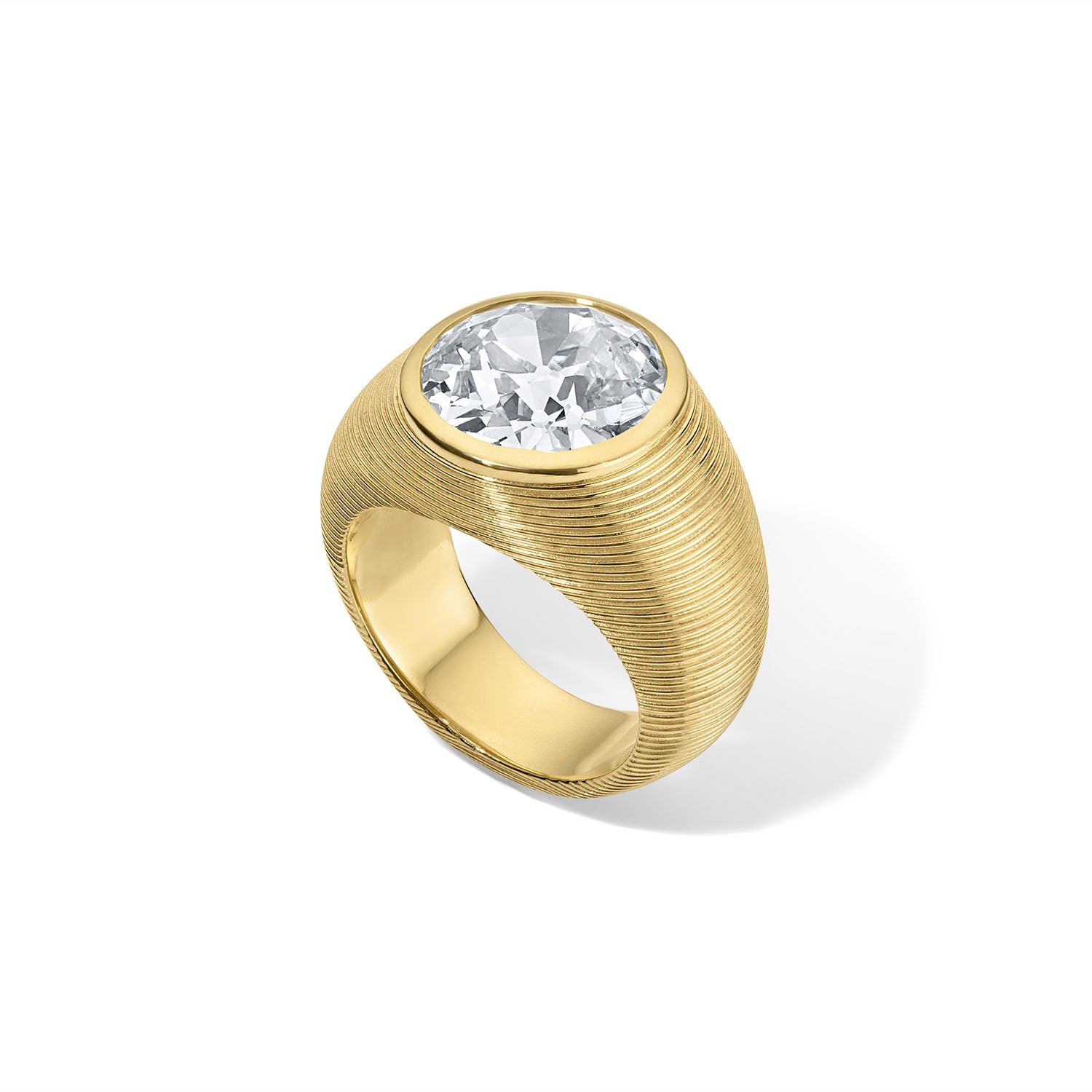 A refined riff on one of our most iconic silhouettes—scaled for the pinky. This one-of-a-kind Pinky Cymbal Ring features a 3.67-carat Old European cut diamond, celebrated for its antique charm and soulful sparkle. Set in a wide, curved face of solid 18-karat yellow gold, the stone’s deep facets and soft shimmer bring warmth and gravity to the ring’s sculptural simplicity.