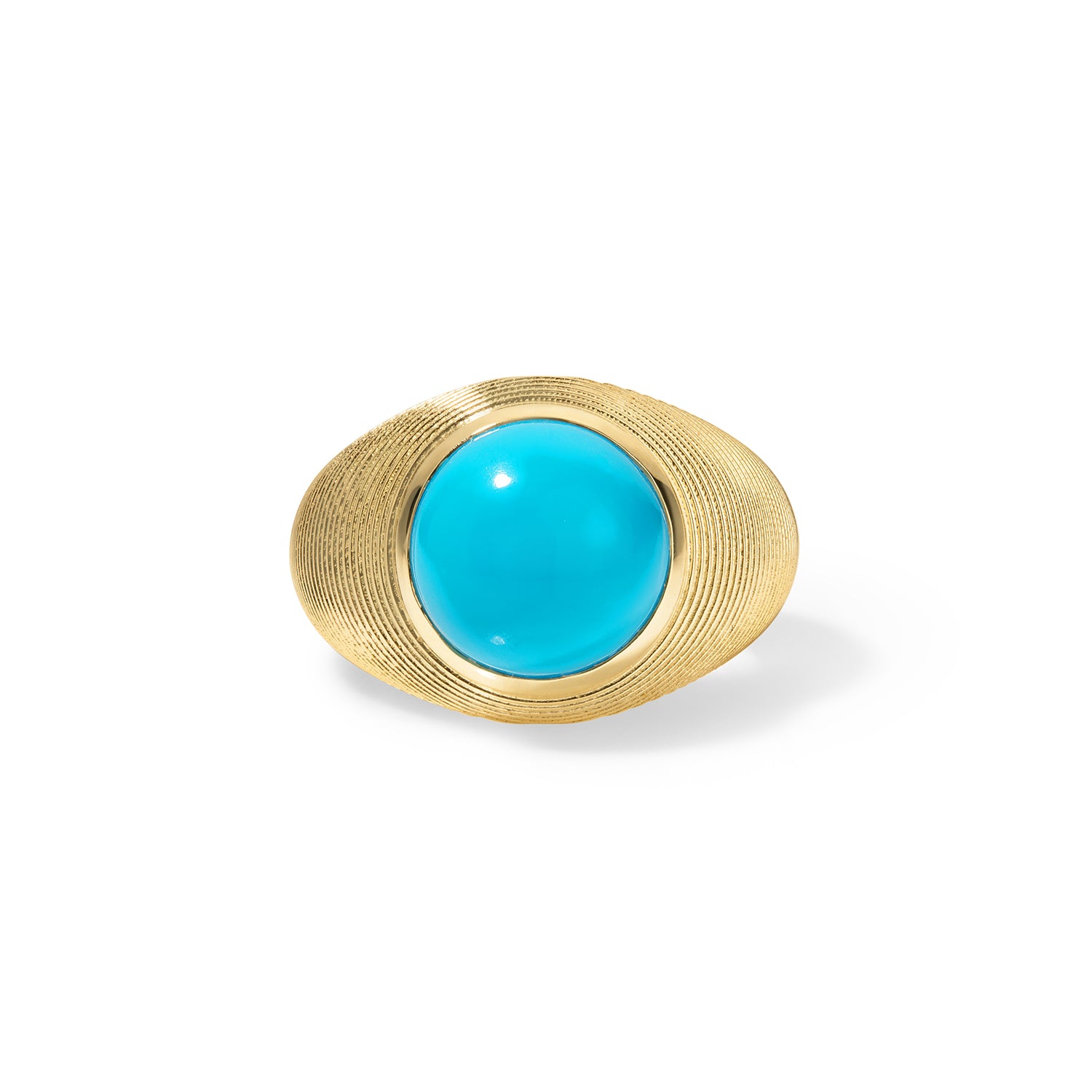 A refined riff on one of our most iconic silhouettes—scaled for the pinky. Part of the Percussion Collection, the Pinky Cymbal Ring pays tribute to rhythm, memory, and emotion passed down through music. This one-of-a-kind version features a striking 3.80-carat turquoise cabochon, set in a smooth, rounded face of solid 18-karat yellow gold.