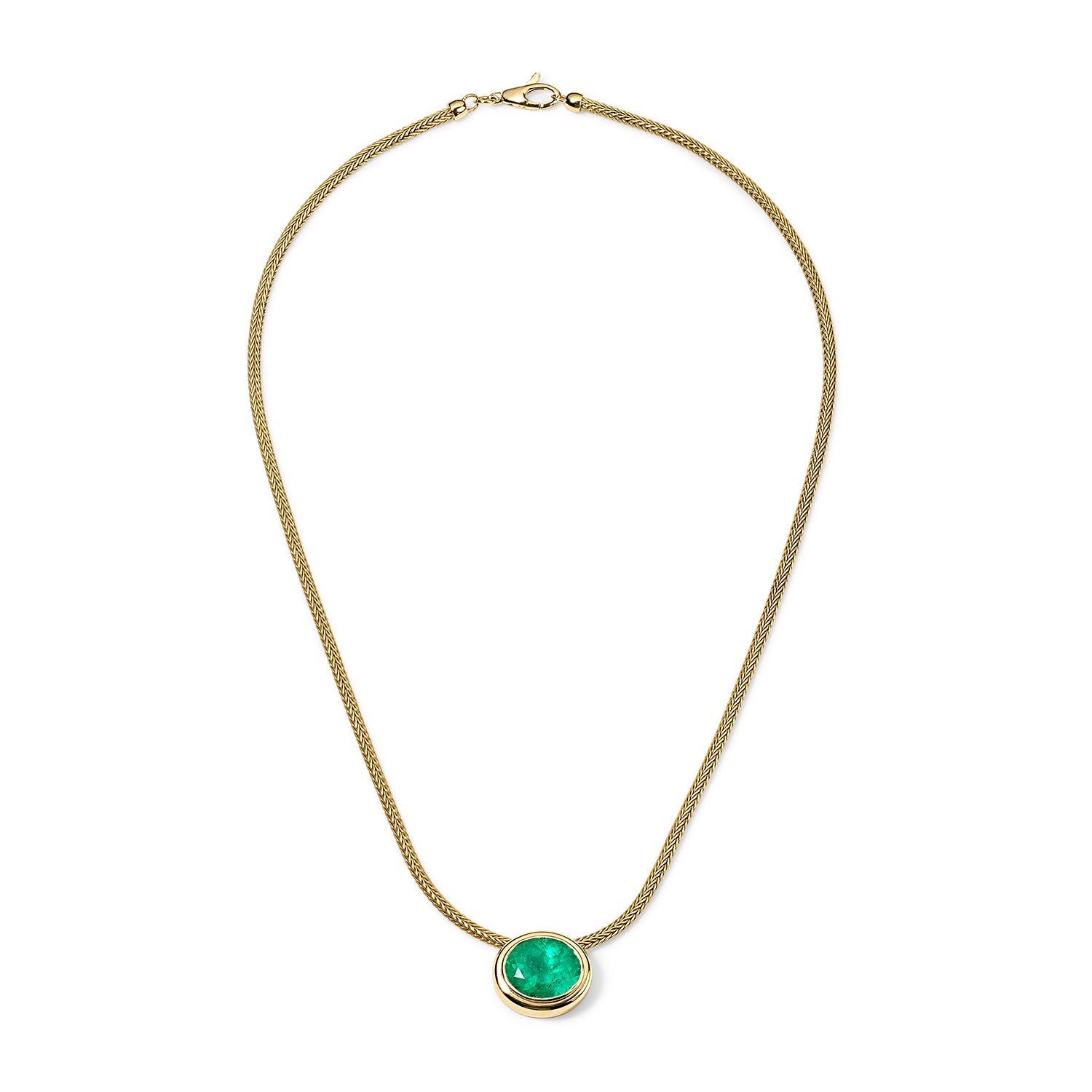 A modern heirloom designed to highlight the stone of your choosing, the Josephine Necklace features a pillowy double bezel setting that appears to float from our signature woven mesh Small Leo chain—softly sculpted and subtly weighty—for a clean, elegant silhouette. Crafted in solid 18-karat gold and tailored to sit just at the collarbone, it’s refined, intentional, and built to last.