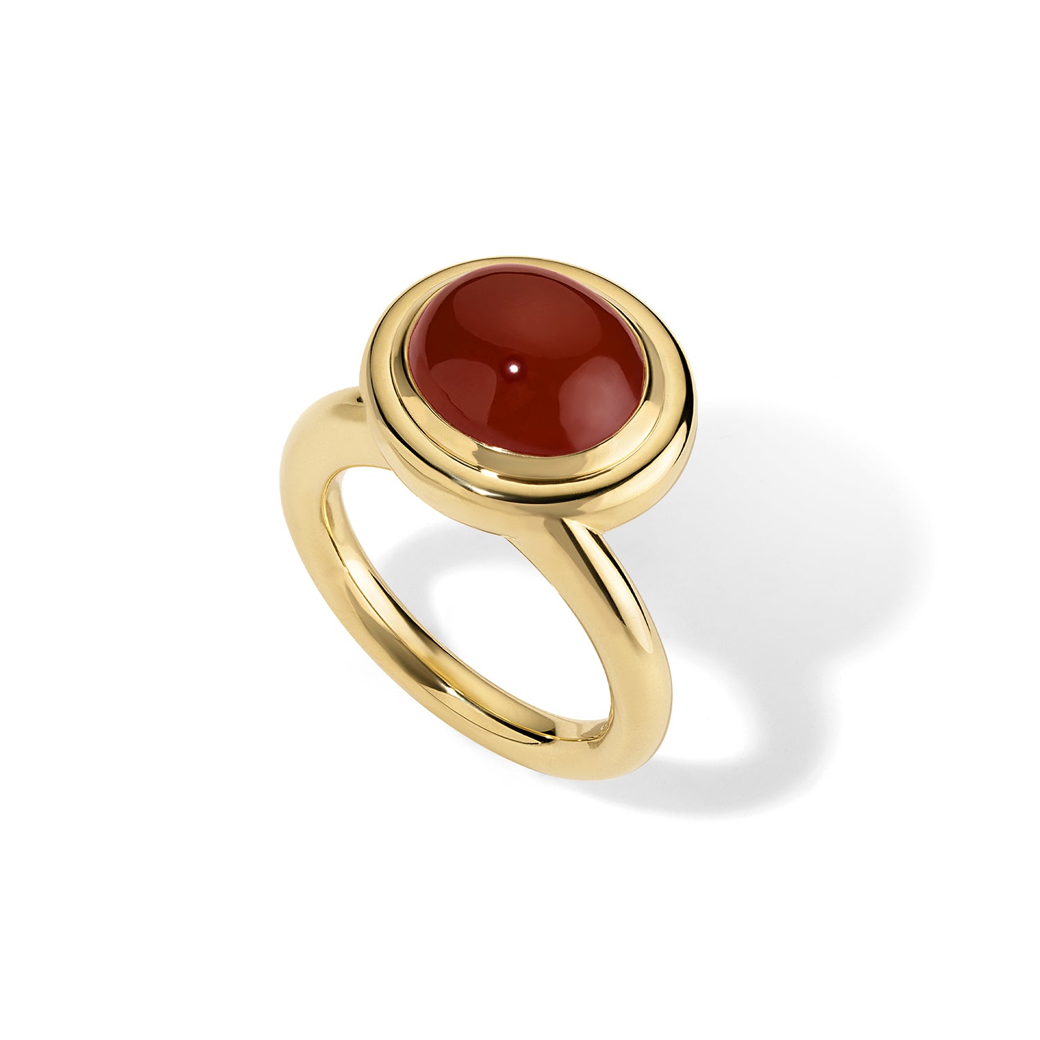 Designed to center what matters, the Josephine Ring features a pillowed double bezel setting, sculpted to frame a 4.80-carat red carnelian. The form is substantial yet restrained—cast in solid 18-karat yellow gold with soft curves and clean lines.