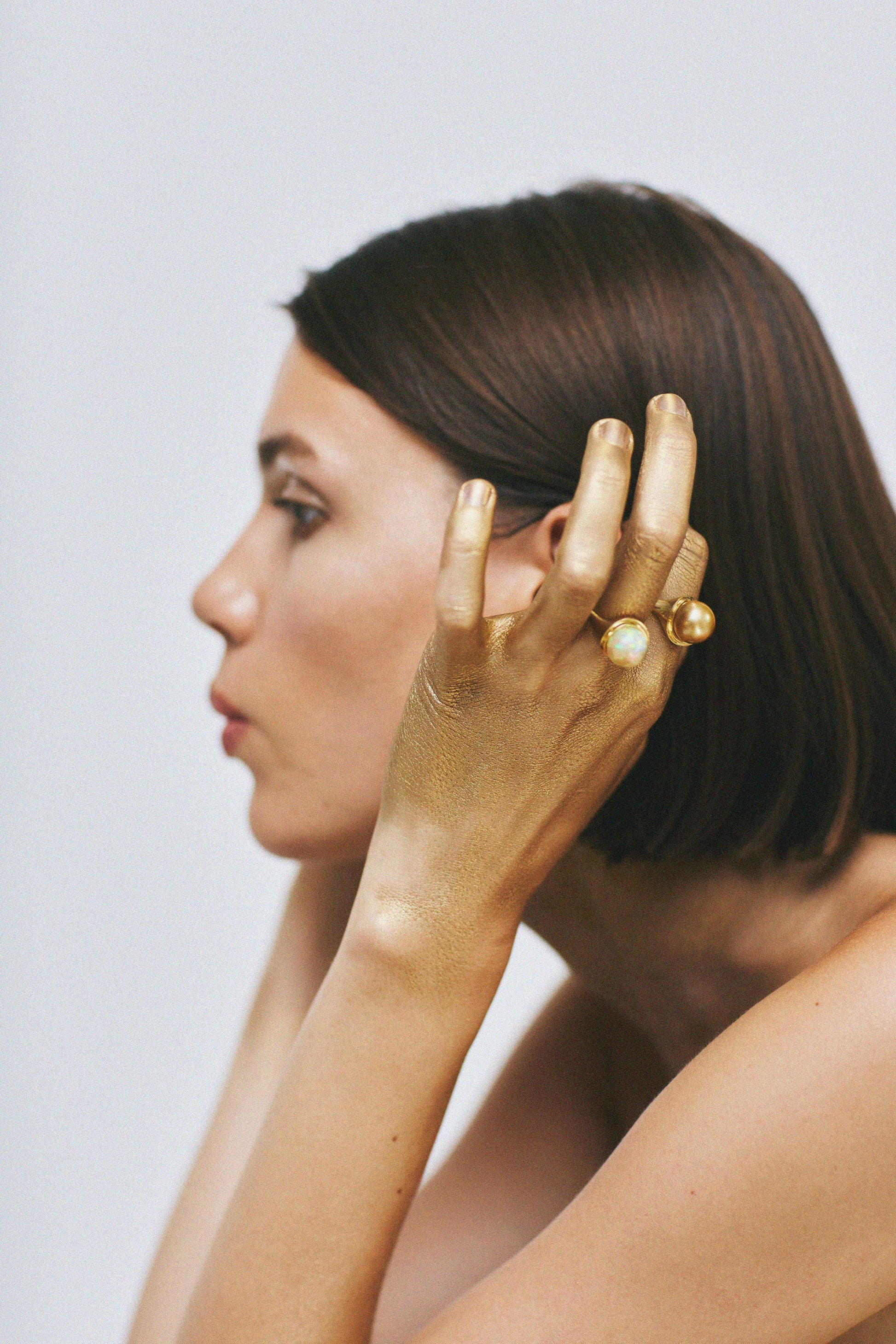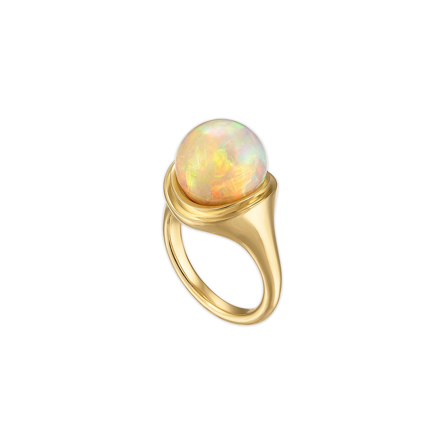 A bold expression of softness and shine, the Opal Pop Ring transforms the playful spirit of the ’90s into a sophisticated statement. At its center: a 12mm opal marble, hand-selected for its luminous flashes and swirling iridescence. Set in a rounded dome of solid 18-karat yellow gold, the effect is both nostalgic and otherworldly.