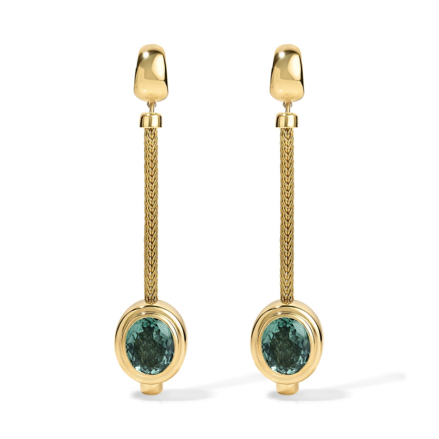 The Josephine Earrings pair the collection’s signature pillowy bezel setting with 2” drops of our woven mesh Small Leo chain—creating a silhouette that sways with intention and catches light in motion. Refined yet expressive, the design celebrates clarity, color, and the quiet luxury of thoughtful proportion.