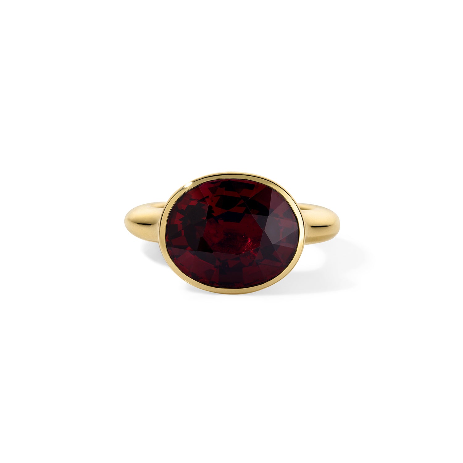 Small scale, big attitude. Designed as a pinky ring, this Úna features a 6.35-carat garnet—deep, saturated, and high-domed—set low into a rounded 18-karat yellow gold band. The negative space under the stone adds a flash of skin and a hint of playfulness, keeping the piece feeling feminine despite its density.