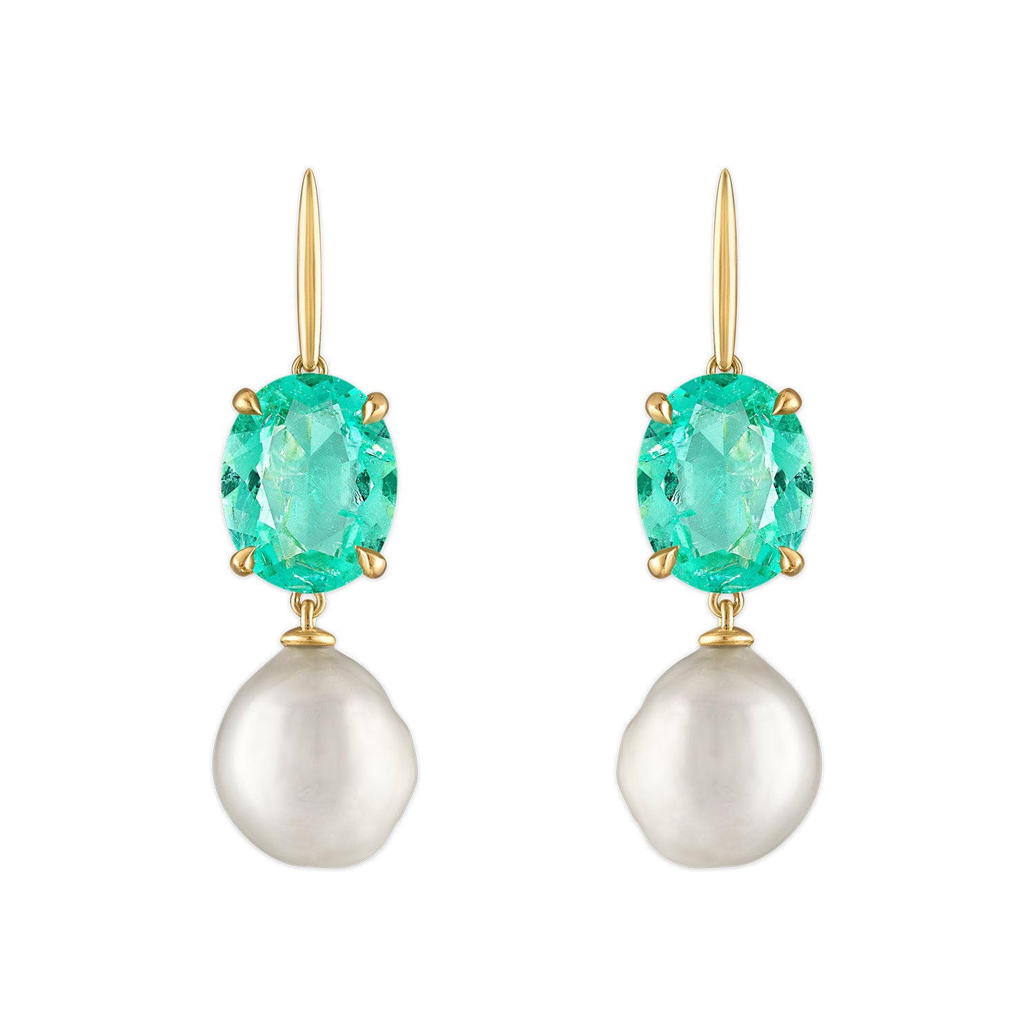 A study in contrast and harmony, this one-of-a-kind pair features two vivid oval-cut Muzo Colombian emeralds—celebrated for their lush, saturated green—paired with luminous baroque pearls. Suspended from delicate 18-karat gold hooks, the stones are designed to move with you, catching light and shifting with every step.