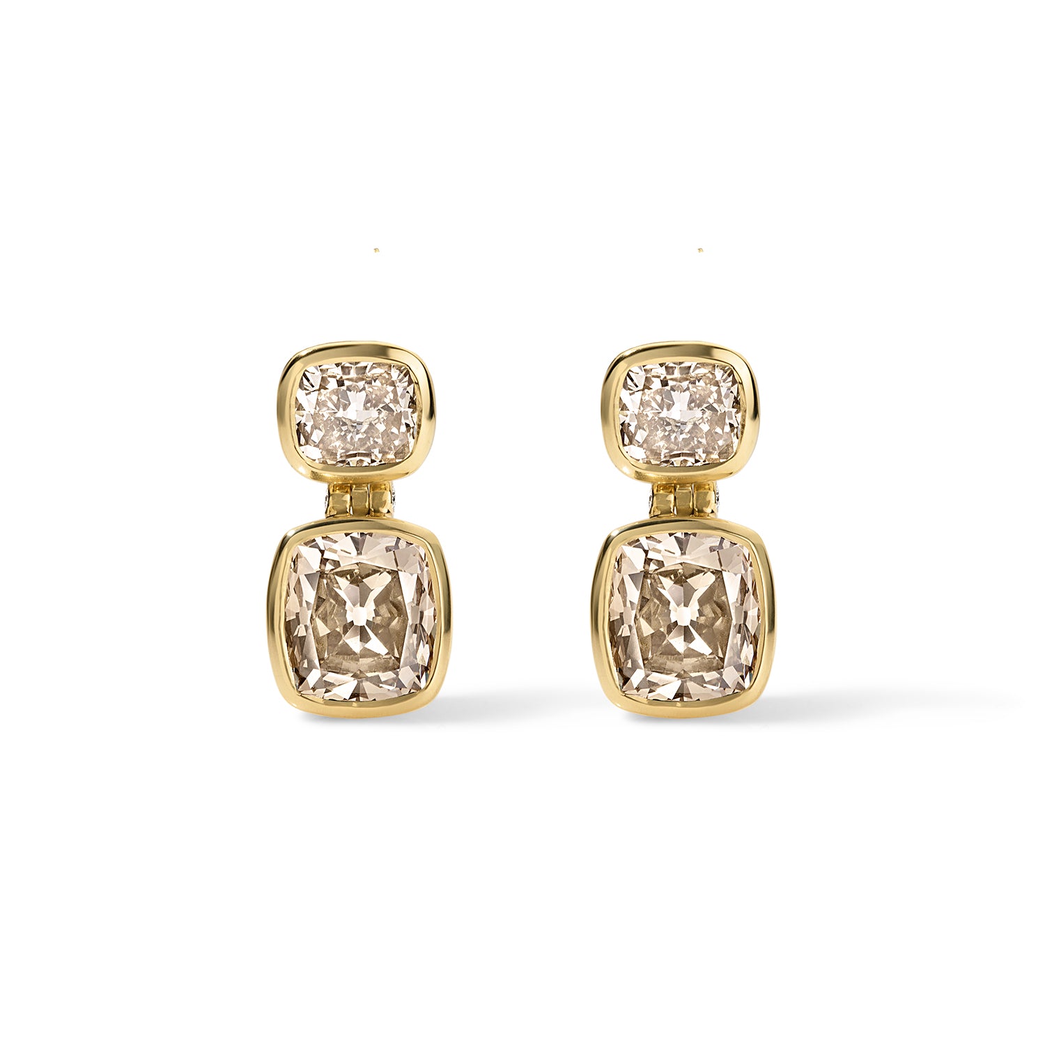 The tops feature 1.51 total carats of antique old mine brilliant diamonds—each one individually selected for its fire and character. Suspended below are 4.17 total carats of cushion-cut natural fancy brown-yellow diamonds, GIA certified for authenticity and hue. The effect is luminous and unexpected: warm, faceted light in motion.
