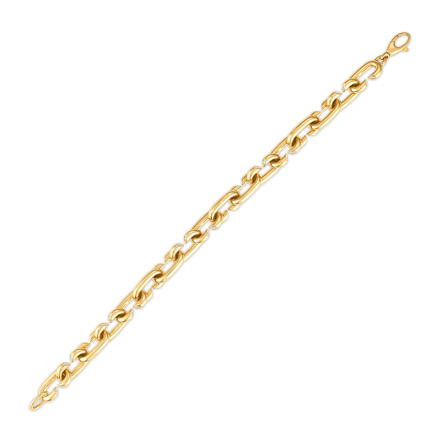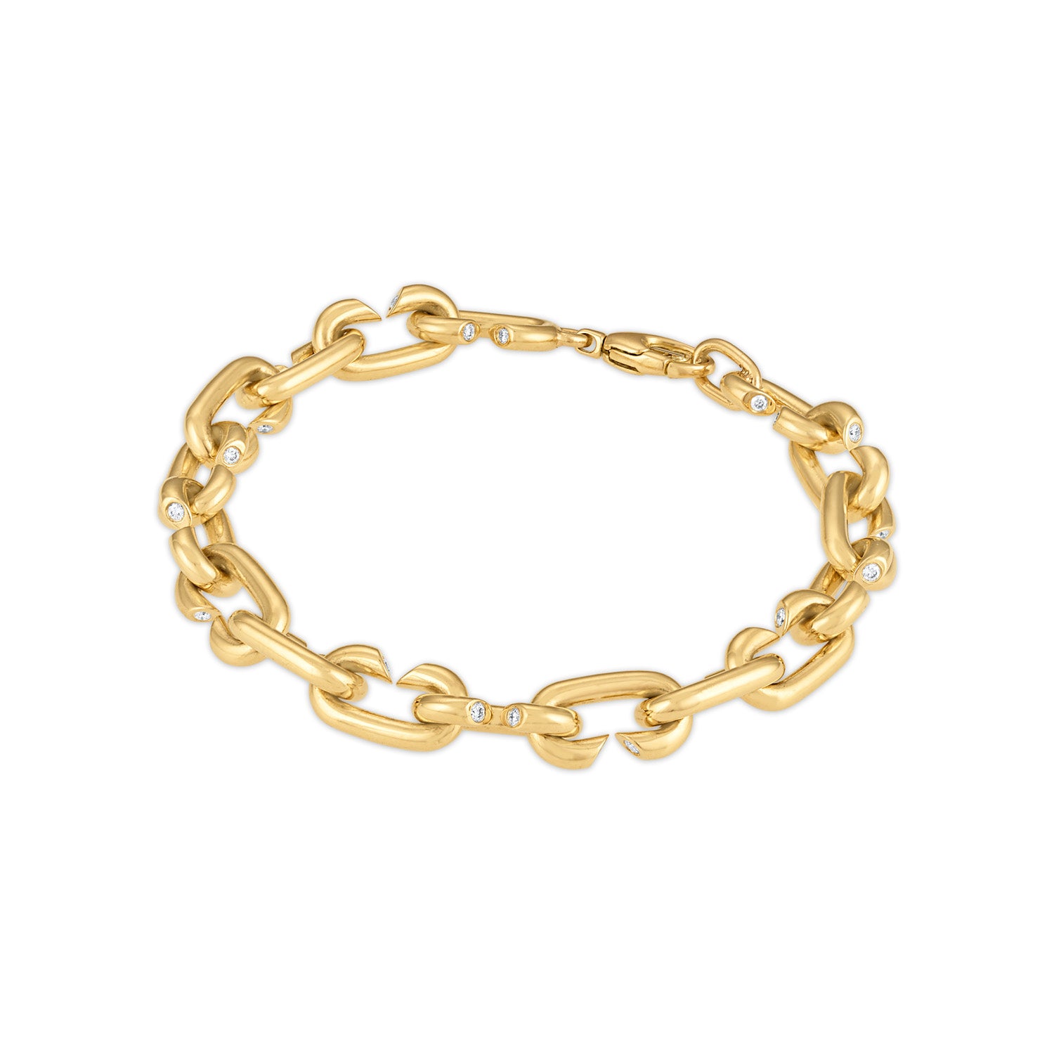 A sculptural chain bracelet in solid 18k yellow gold, set with 0.75 carats of round diamonds. Oval links with softened angles lend a fluid drape along the wrist, while our signature sneaky diamonds are embedded in each link — an intentional detail designed to catch the light in motion. Secured with a classic toggle closure for ease and elegance in everyday wear.
