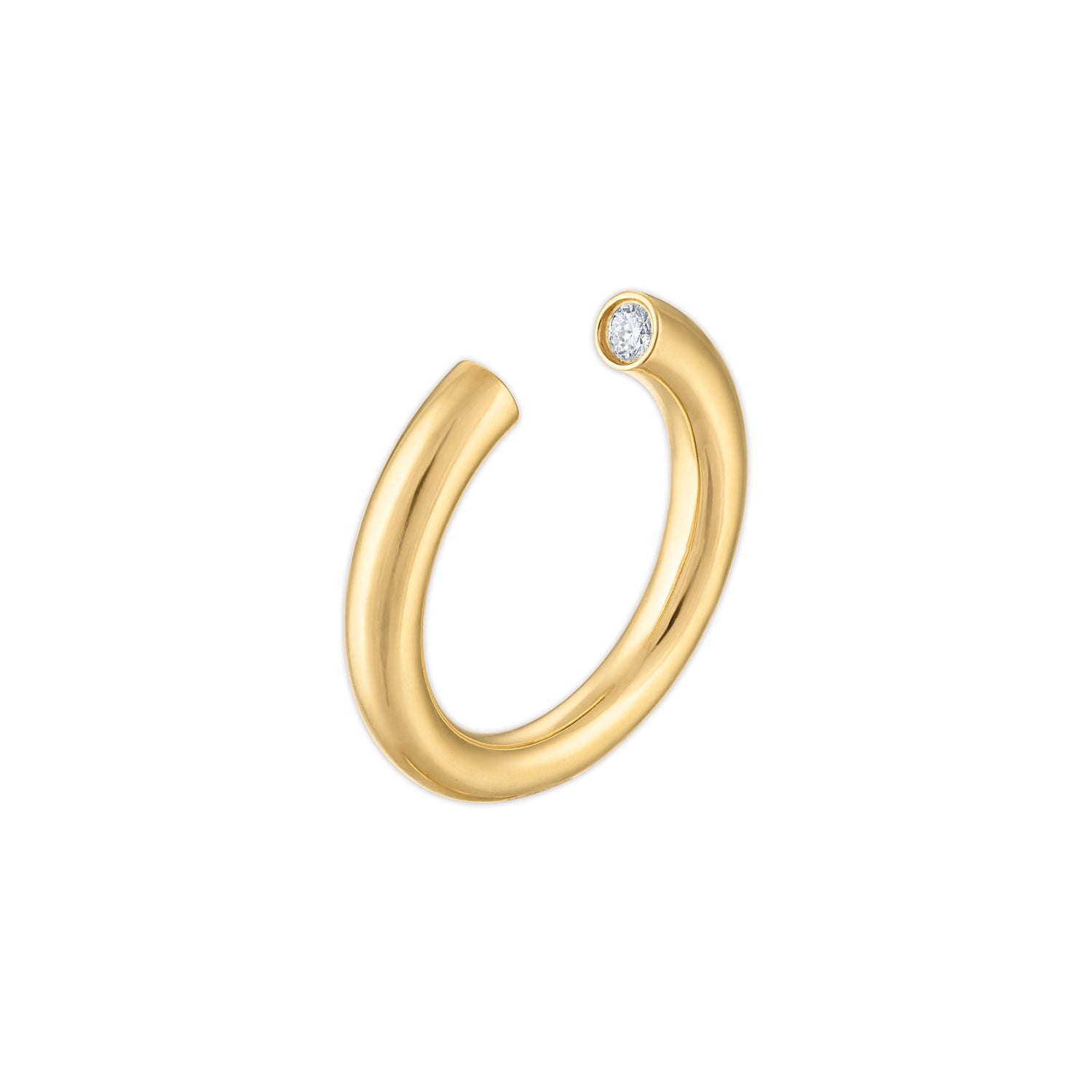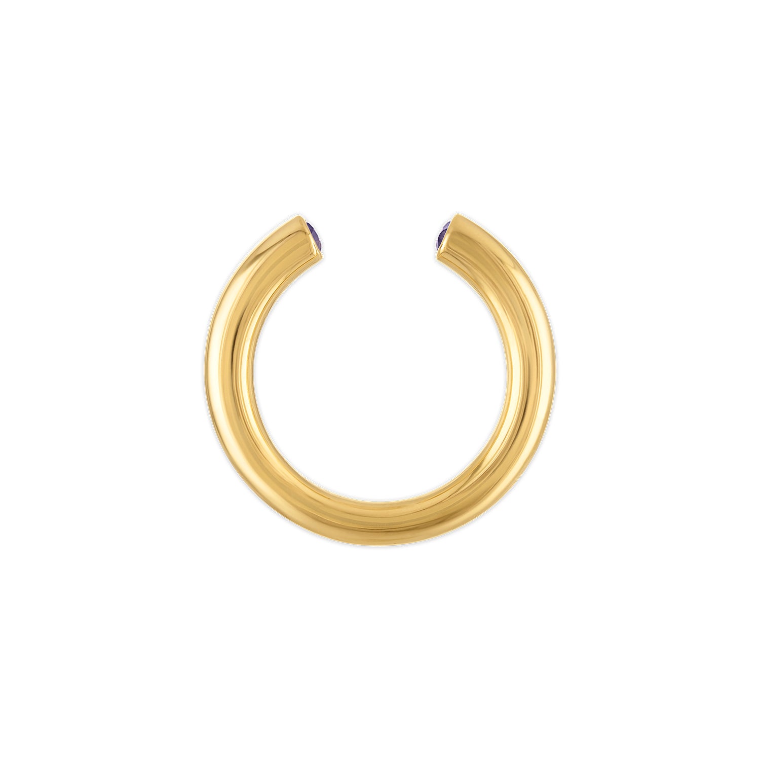 A sculptural open band in solid 18k yellow gold, set with two 2.5mm gemstones totaling approximately 0.20 carats. The Atha ring is defined by its bold, minimal form—weighty, smooth, and softened by curved edges. Each stone is set flush at the open ends, creating a subtle play of light from unexpected angles. A refined, timeless piece designed for everyday wear.