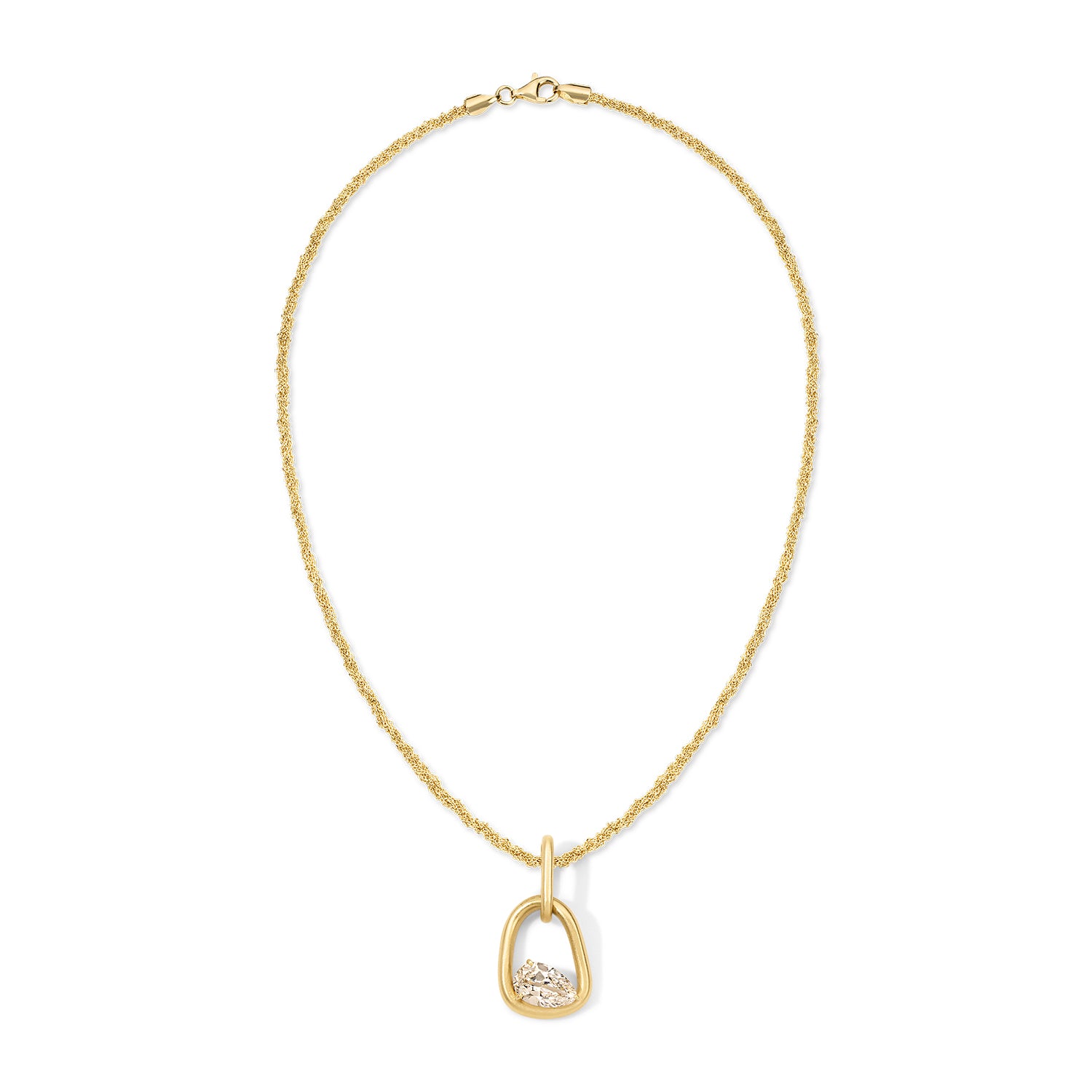 Cast in satin-finish 18k yellow gold, the pendant holds a 3.42-carat fancy faint brown pear-shaped diamond—hand-selected for its depth, clarity, and restrained luminosity. It’s fitted with a removable Atha link clip, designed to clip seamlessly into our chains or the Atha Necklace for effortless versatility. Clean lines and intentional form give the piece a grounded elegance meant to be worn close to the skin.