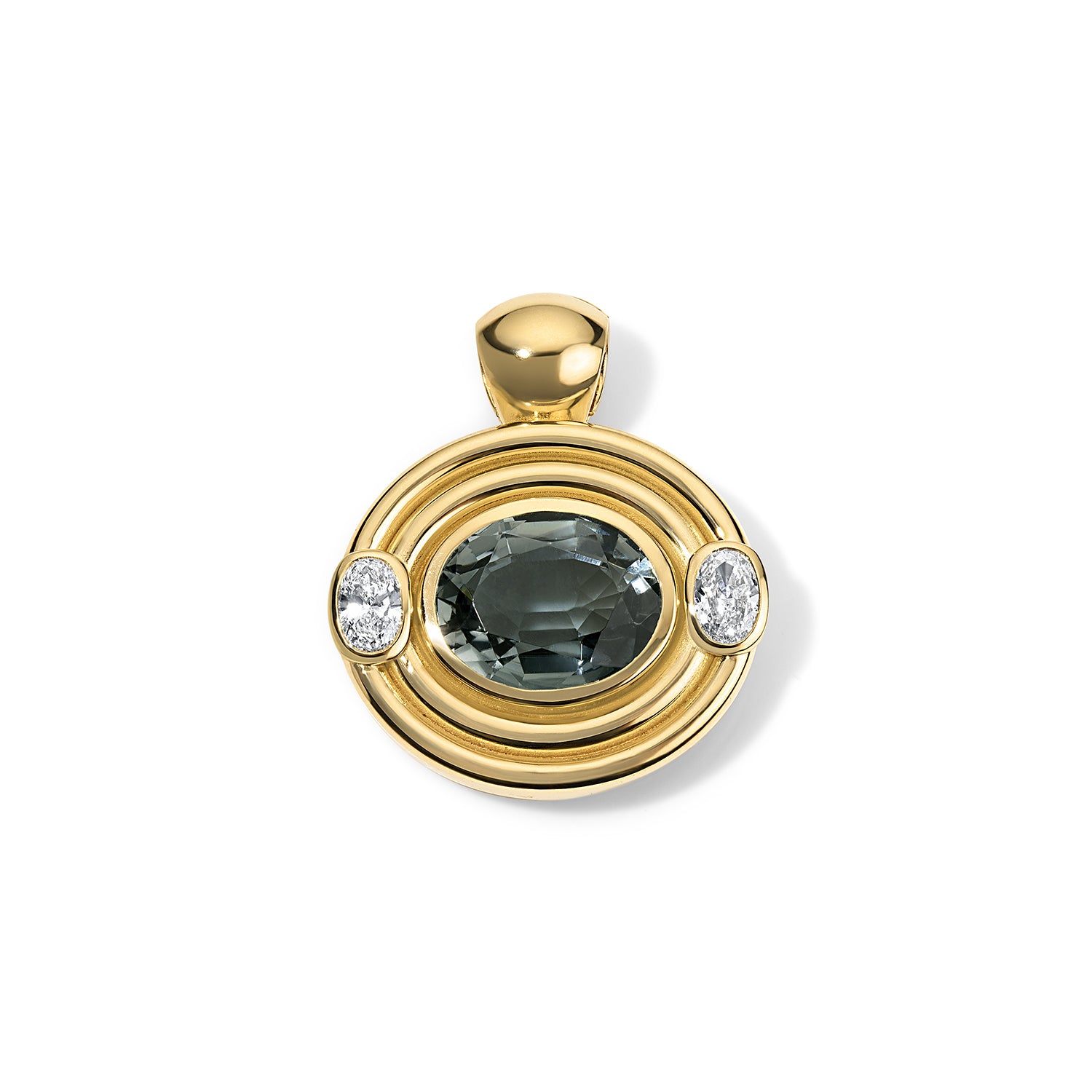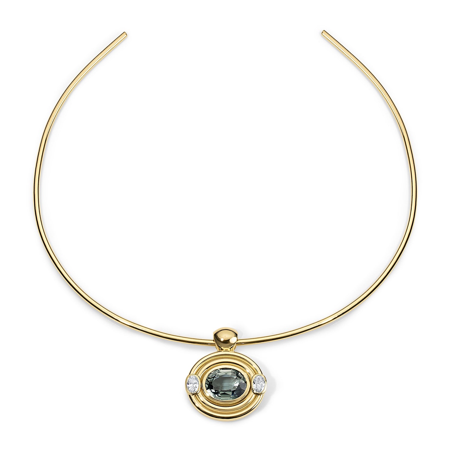 A study in subtle contrasts. The Frankie Pendant centers a luminous 6.99-carat blue-gray tourmaline—its cool, oceanic depths captured within clean 18k yellow gold. Two oval diamonds totaling 0.71 carats provide quiet brilliance, their placement creating balance without ostentation.