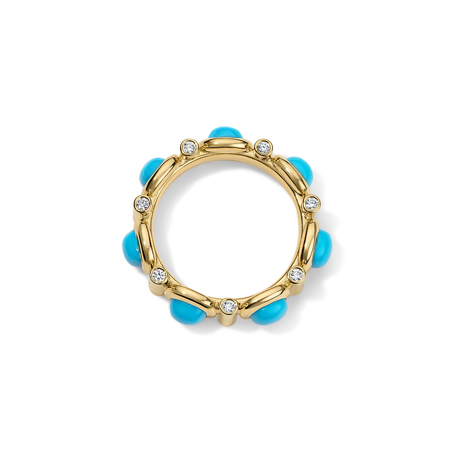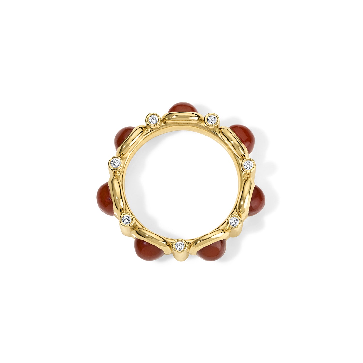 A refined eternity band with a twist. The Gilda Ring features seven cushion-cut cabochon gemstones, each bezel-set in solid 18-karat yellow gold. Between every stone, G VS white diamonds are subtly placed at the top and bottom of the band—adding a discreet flash of light from every angle.