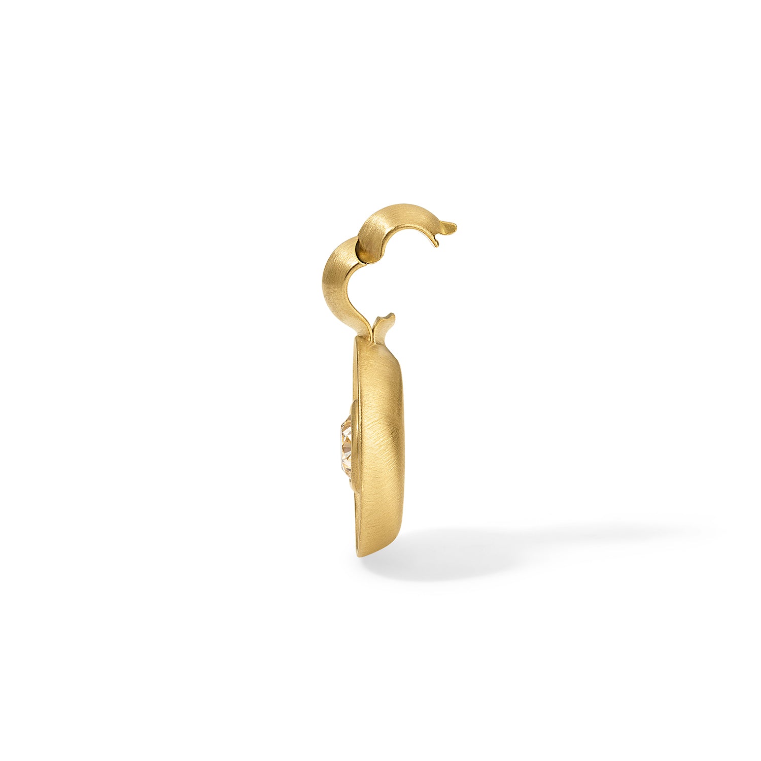 This one-of-a-kind version features a 1.10-carat oval warm antique diamond, set east-west in satin-finished 18-karat yellow gold. The sculptural silhouette is finished with a hinged bail that opens and closes, allowing it to be worn on a variety of chains, cords, or torques.