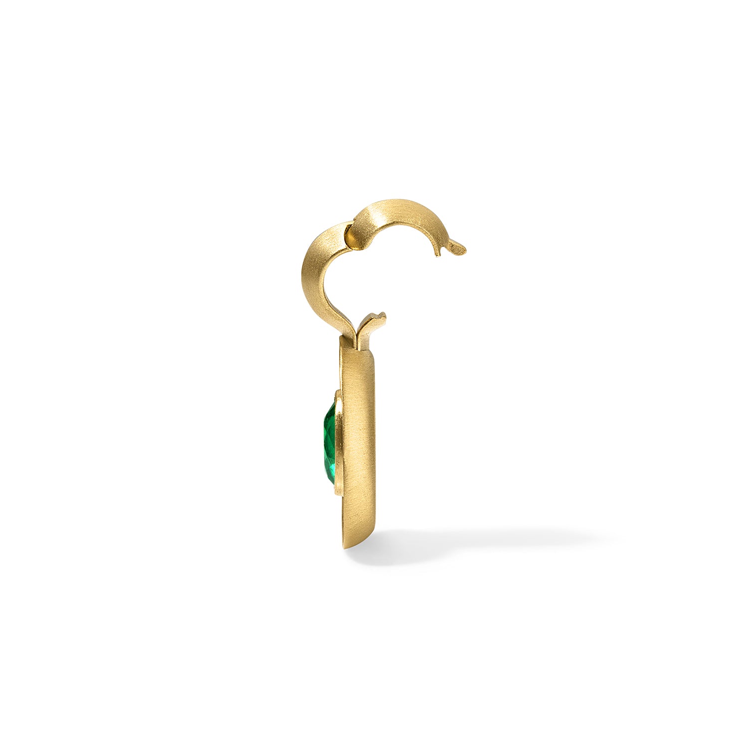Set in satin-finished 18-karat yellow gold, the emerald’s vivid green hue offers a soft, luminous contrast to the brushed metal. A hinged bail opens and closes, allowing the pendant to be worn on a variety of chains, cords, or torques.