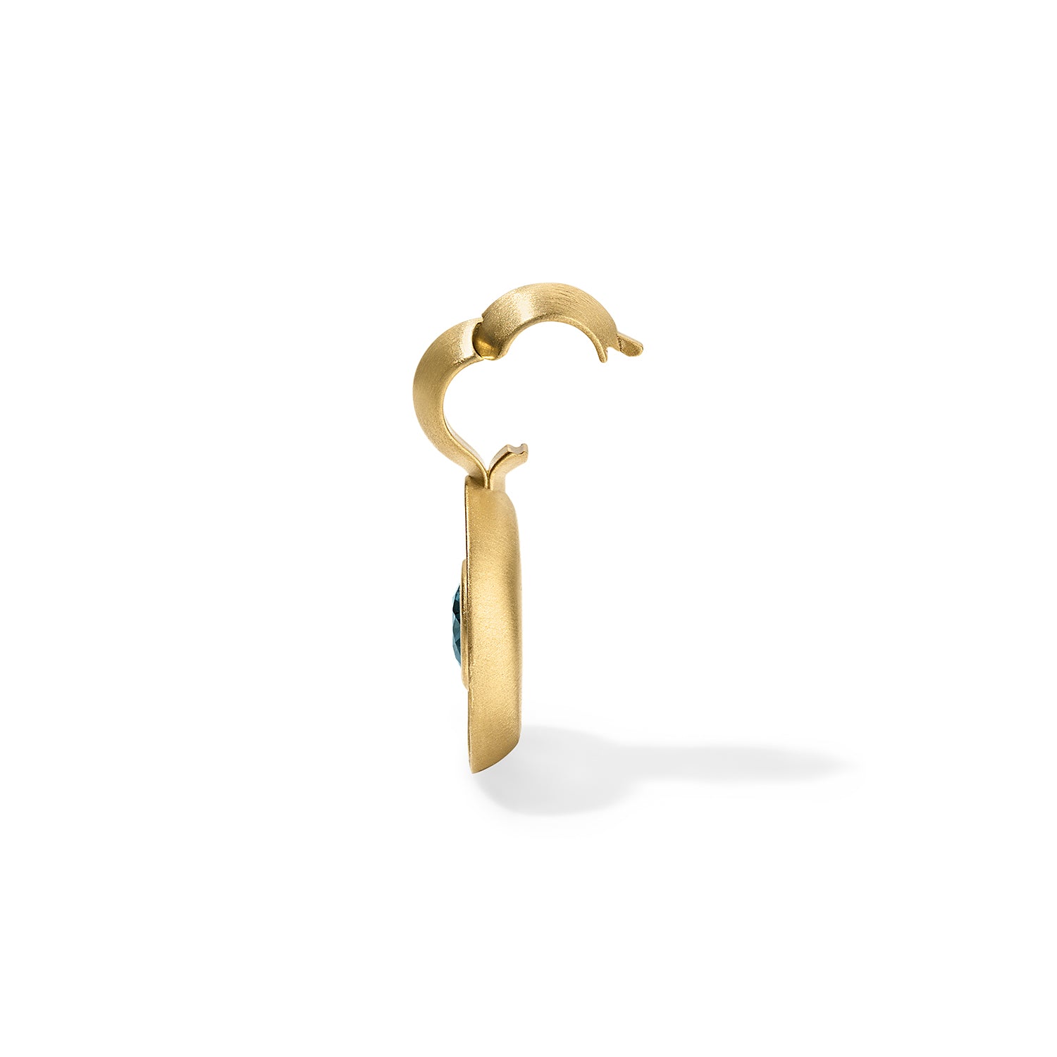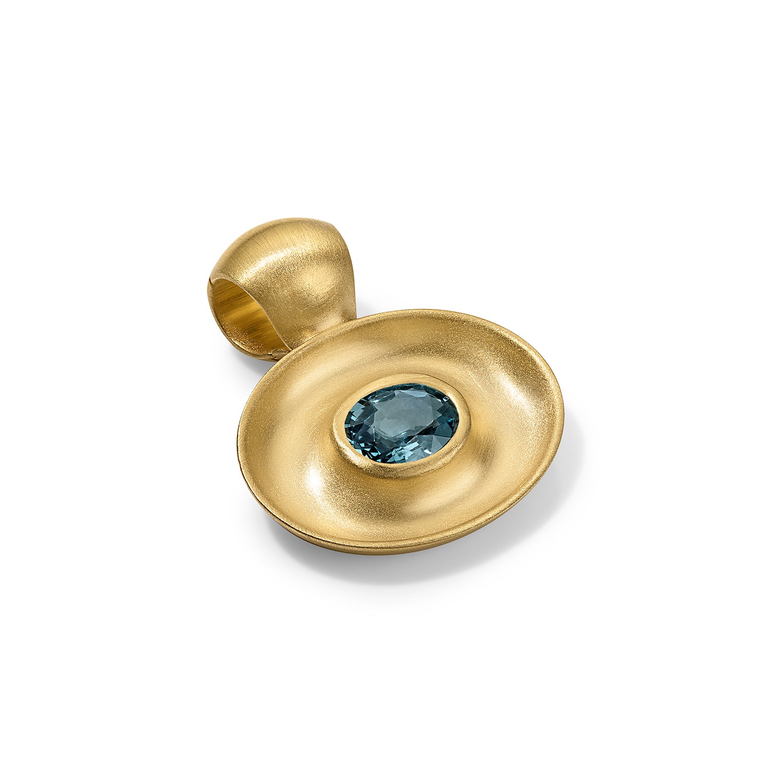 This one-of-a-kind version features a 1.17-carat oval gray spinel, set east-west in satin-finished 18-karat yellow gold. The sculptural silhouette is finished with a hinged bail that opens and closes, allowing it to be worn on a variety of chains, cords, or torques.