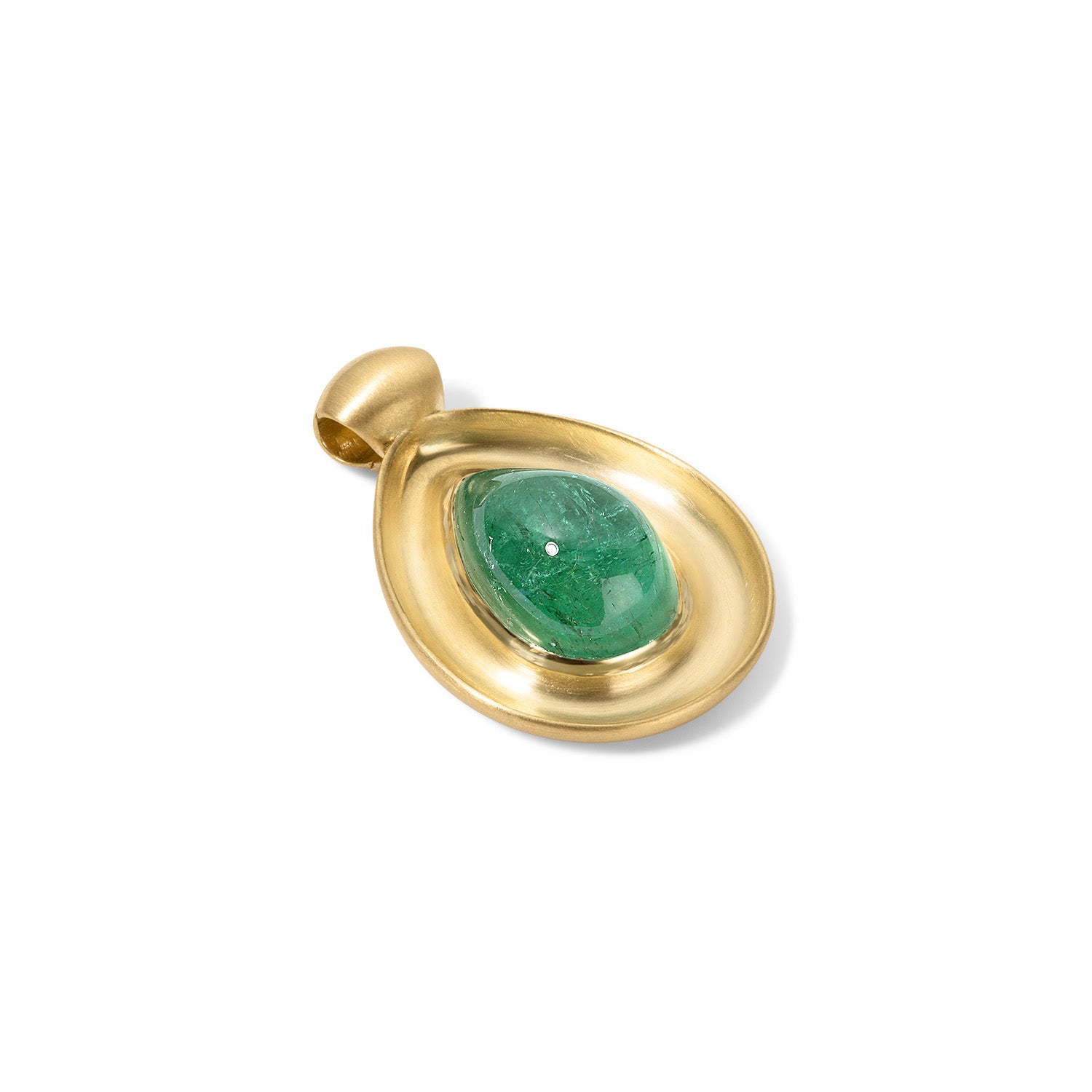 This one-of-a-kind version features a 13.35-carat pear-shaped Paraiba tourmaline cabochon, held in satin-finished 18-karat yellow gold. Its vivid, watery tone is grounded by the pendant’s clean lines and substantial form. A hinged bail allows it to be worn across chains, cords, or torques—elevating everyday ritual.
