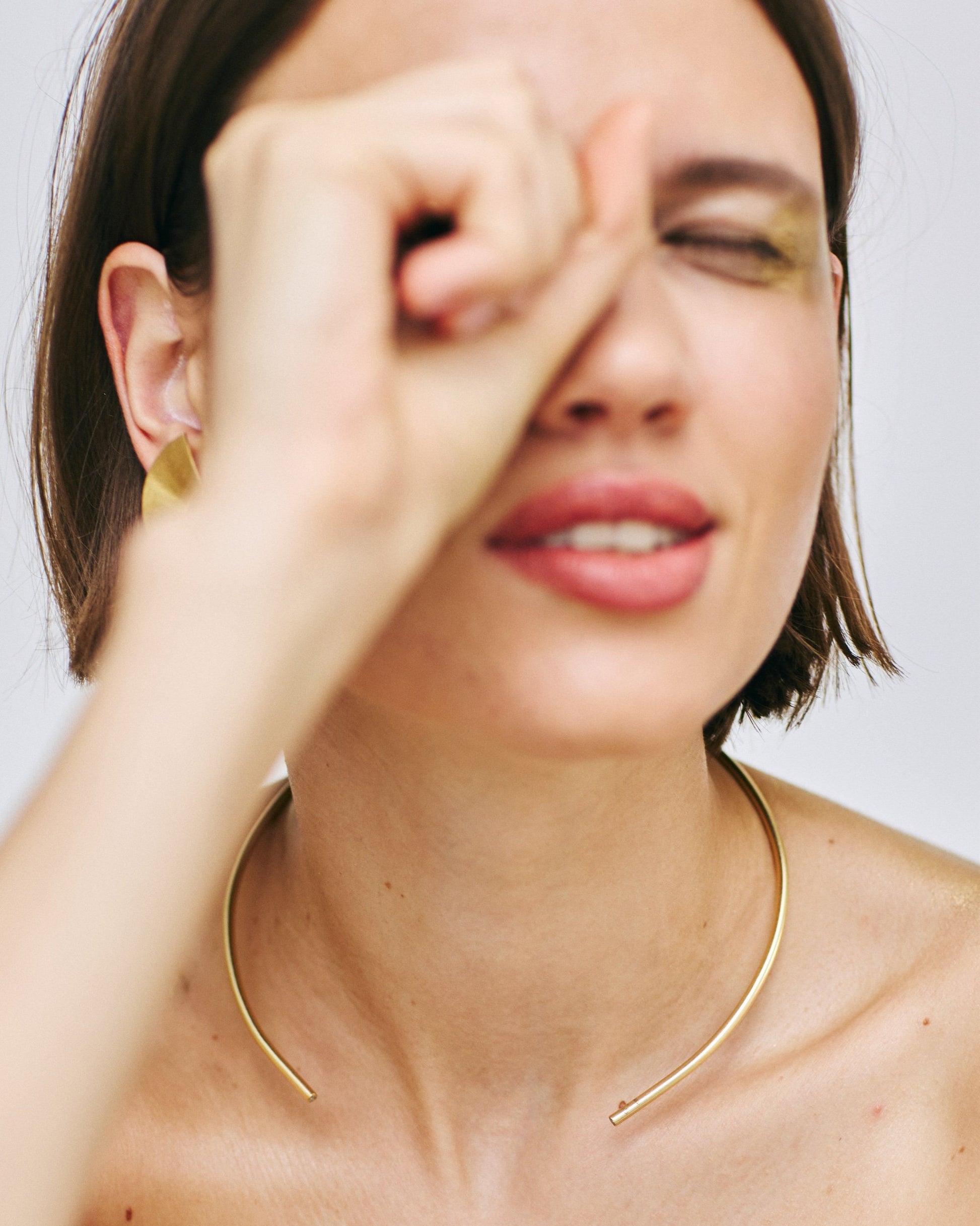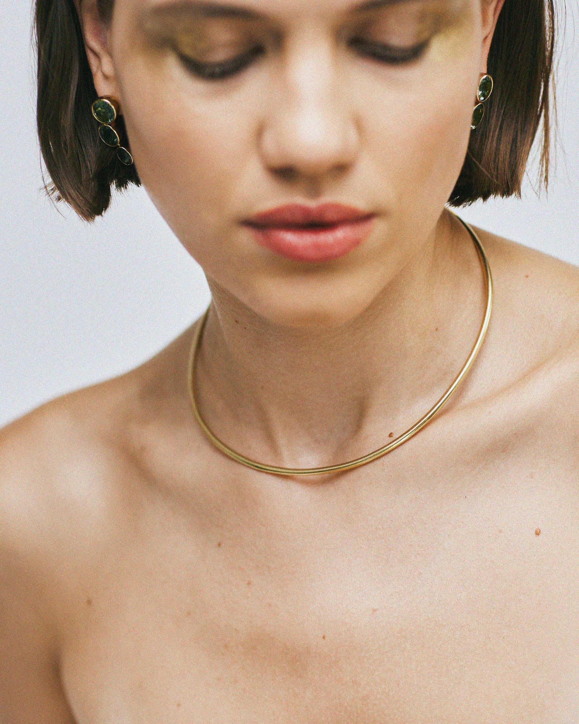 A minimal silhouette with a hidden twist. The Torque Necklace is a clean, sculptural essential—open at the back for ease and comfort, with two sneaky diamonds set discreetly at the tips for a quiet flash of brilliance.