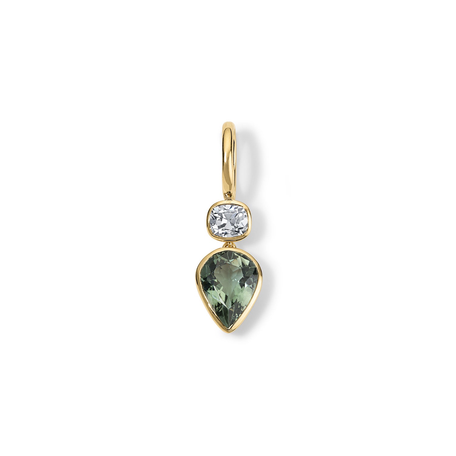 This one-of-a-kind version features a 3.55-carat pear-shaped green tourmaline suspended beneath a 1.00-carat antique old mine cut diamond. Set in high-polish 18-karat yellow gold, the two stones are linked by proportion and contrast—each chosen for its distinct character, together forming a balanced whole.