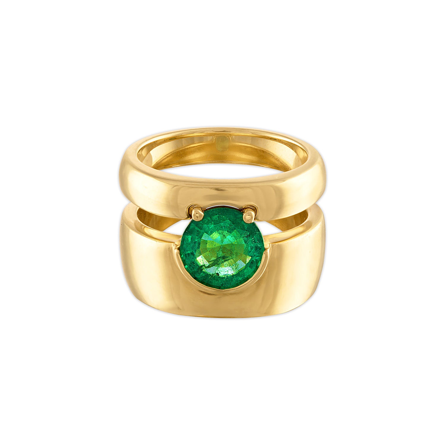 The Markie Ring finds beauty in contrast. A rich green 1.85-carat round emerald floats in a structured frame of high-polish 18-karat yellow gold. Designed with intention, a slender halo of negative space between gem and gold allows light—and skin—to shine through. Chunky and elegant. Bold and unmistakably feminine.