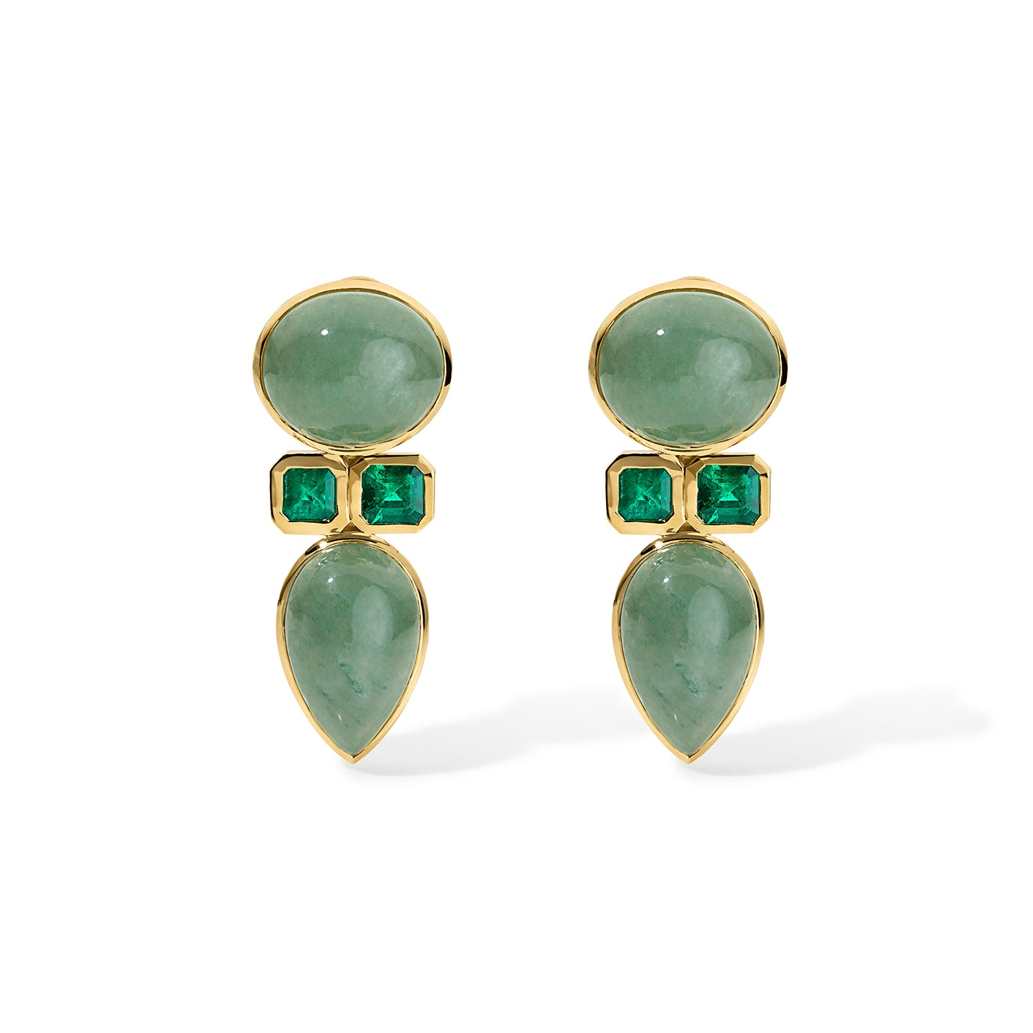 This one-of-a-kind pair features luminous green aventurine in complementary oval and pear silhouettes, bezel-set in warm 18-karat yellow gold. Vivid cushion-cut emeralds adds sharp contrast and structure, grounding the softness of the jade with brilliant intensity. The result is a sculptural silhouette that feels both timeless and unexpected.