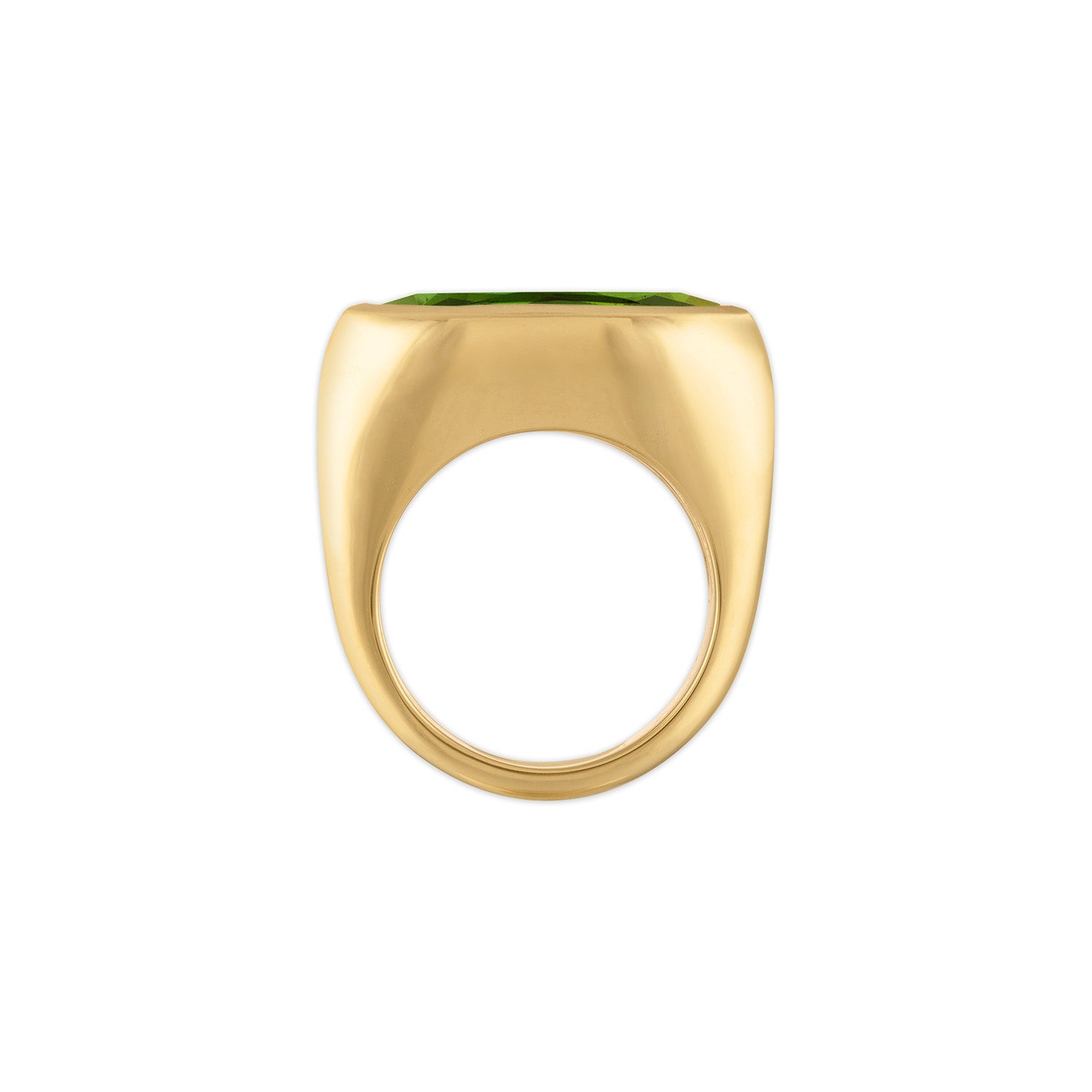 Sculptural and streamlined, the Mesa Ring features a marquise-cut center stone—either faceted or cabochon—set east-west in solid 18-karat yellow gold. The softly tapered silhouette nods to desert plateaus, with smooth, weighty gold rising gently around the elongated stone.