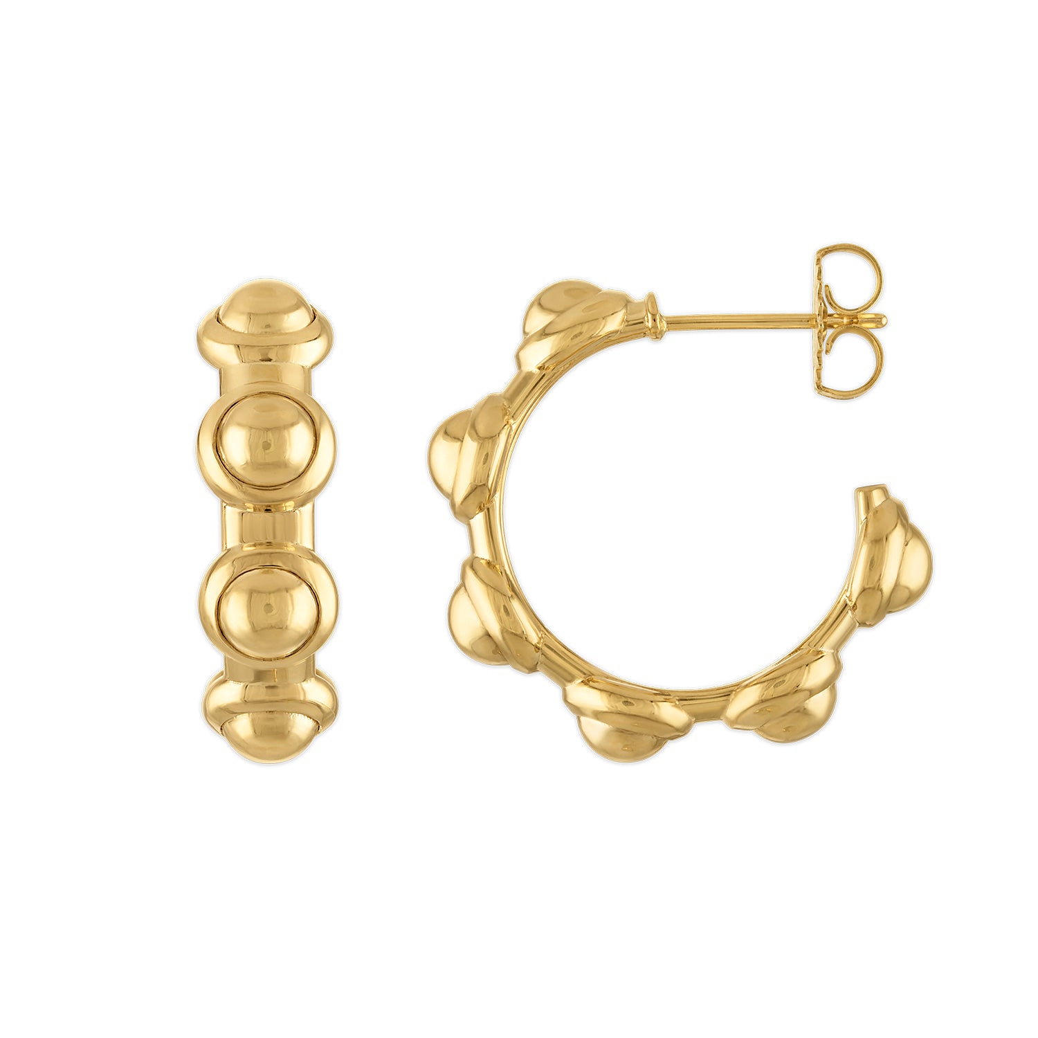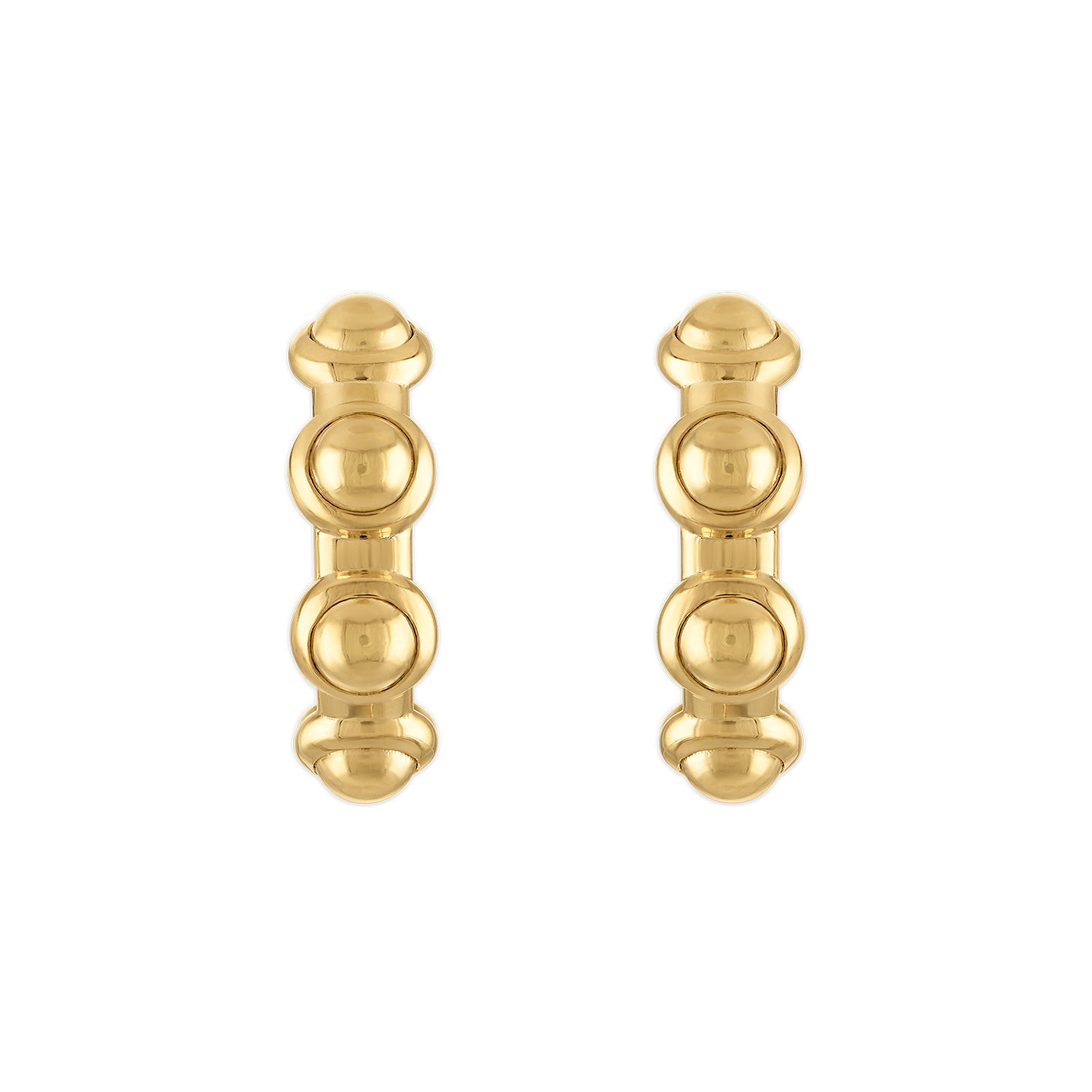 A minimalist riff on a signature silhouette, the Pop Vic Hoops distill the essence of the Vic into a sleek, all-gold form. Crafted in solid 18-karat yellow gold, each hoop features twelve softly domed bezels—graphic, pillowy, and unmistakably Pop.