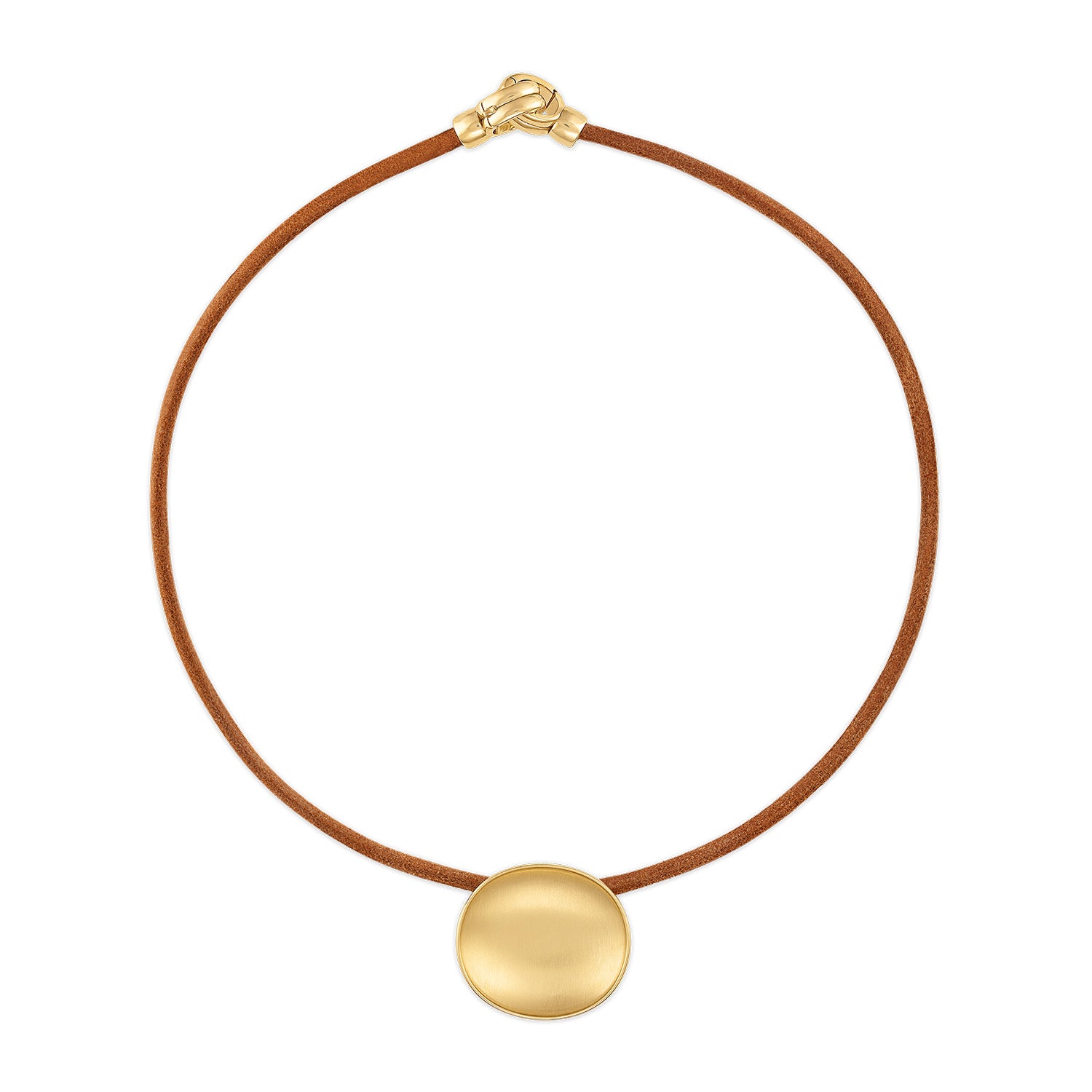 Clean, sculptural, and weighty, the Concave Pendant is cast in solid 18k yellow gold and suspended from a 3mm round cognac leather cord. The softly curved form catches light across its surface, creating subtle dimension with every movement. Finished with a secure 18k yellow gold lobster clasp, the pendant sits at the collar for an understated, everyday statement.