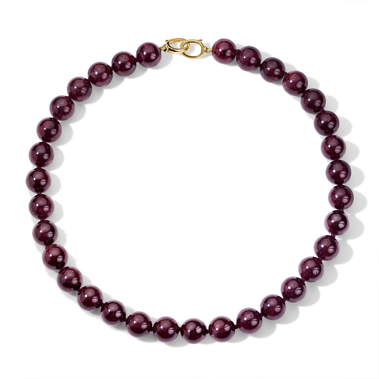 A study in quiet balance, the Beaded Necklace offers a serene interpretation of form and color. Individually hand silk-knotted 10mm Red Garnet beads, its smooth, rounded silhouette evokes a sense of calm strength—substantial yet effortless against the skin.