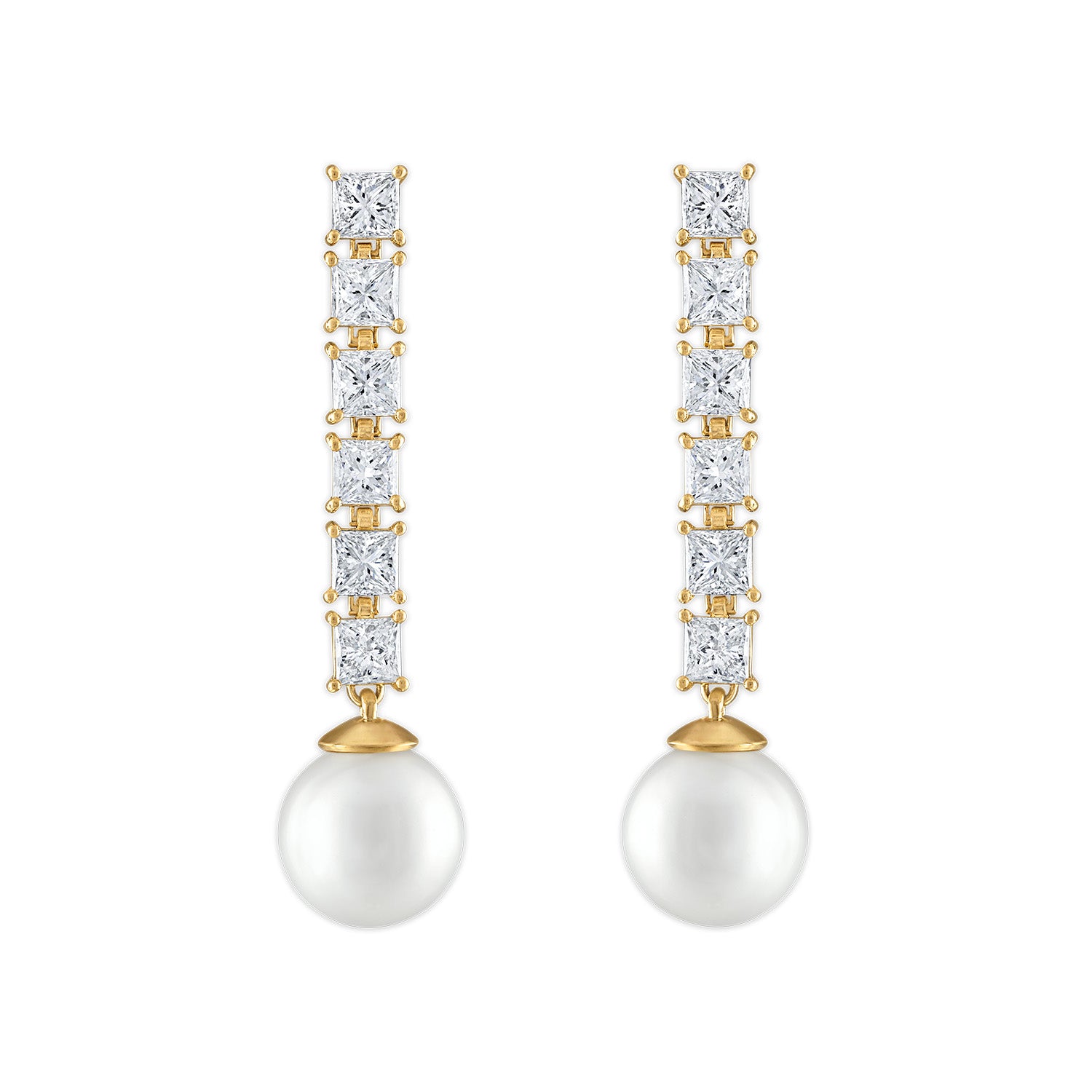 Each earring features a cushion-cut gemstone paired with a luminous pearl, linked in a linear silhouette that feels sculptural yet soft. The 1.5" drop elongates the neckline with just enough swing, balancing precision and organic ease. Set in 18-karat yellow gold, they’re designed to catch the light and hold attention—whether worn solo or as part of a bolder composition.