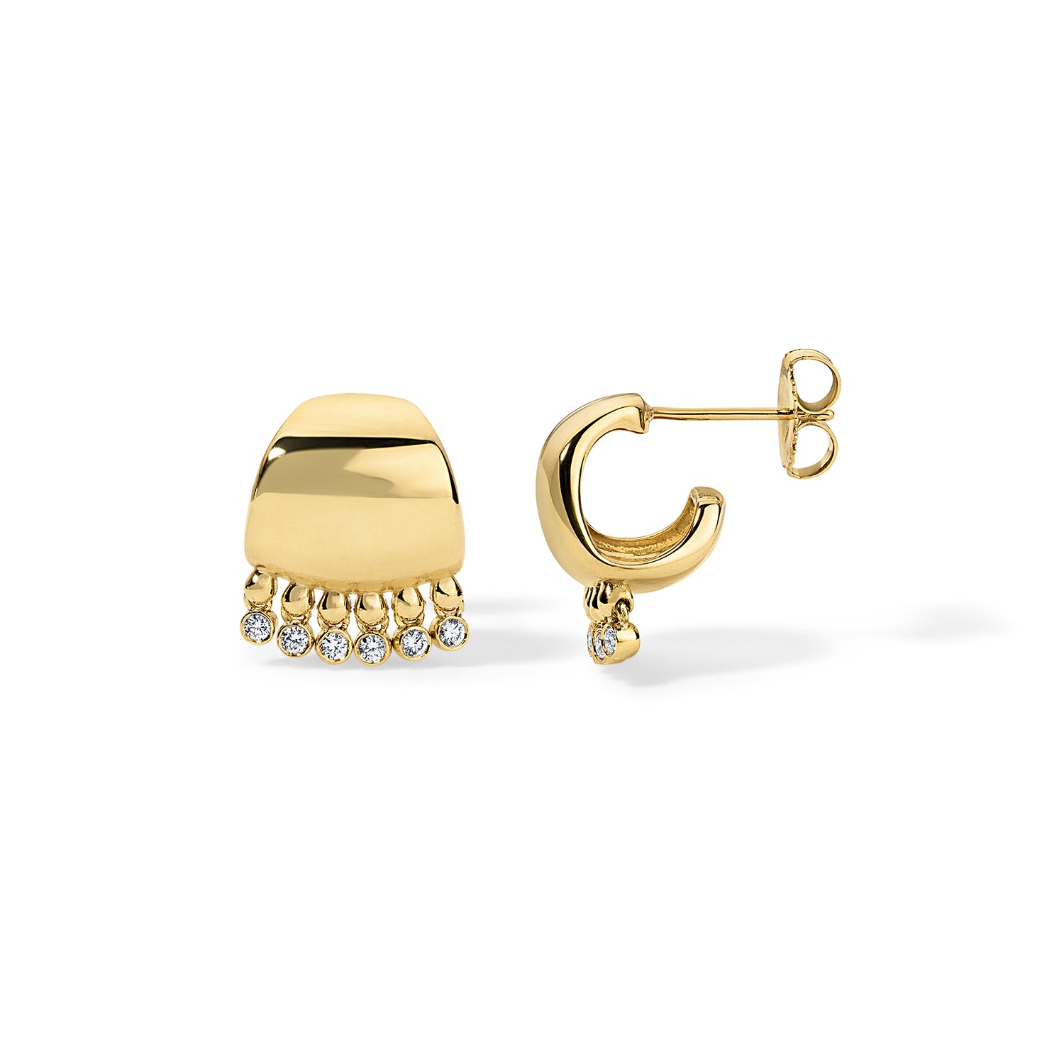 Small in scale, strong in presence. The Tennessee Huggies distill the essence of the Tennessee collection into a quietly striking everyday earring. A smooth arc of solid 18-karat gold is accented with the signature diamond fringe—each G VS brilliant-cut stone set to shimmer subtly with movement.