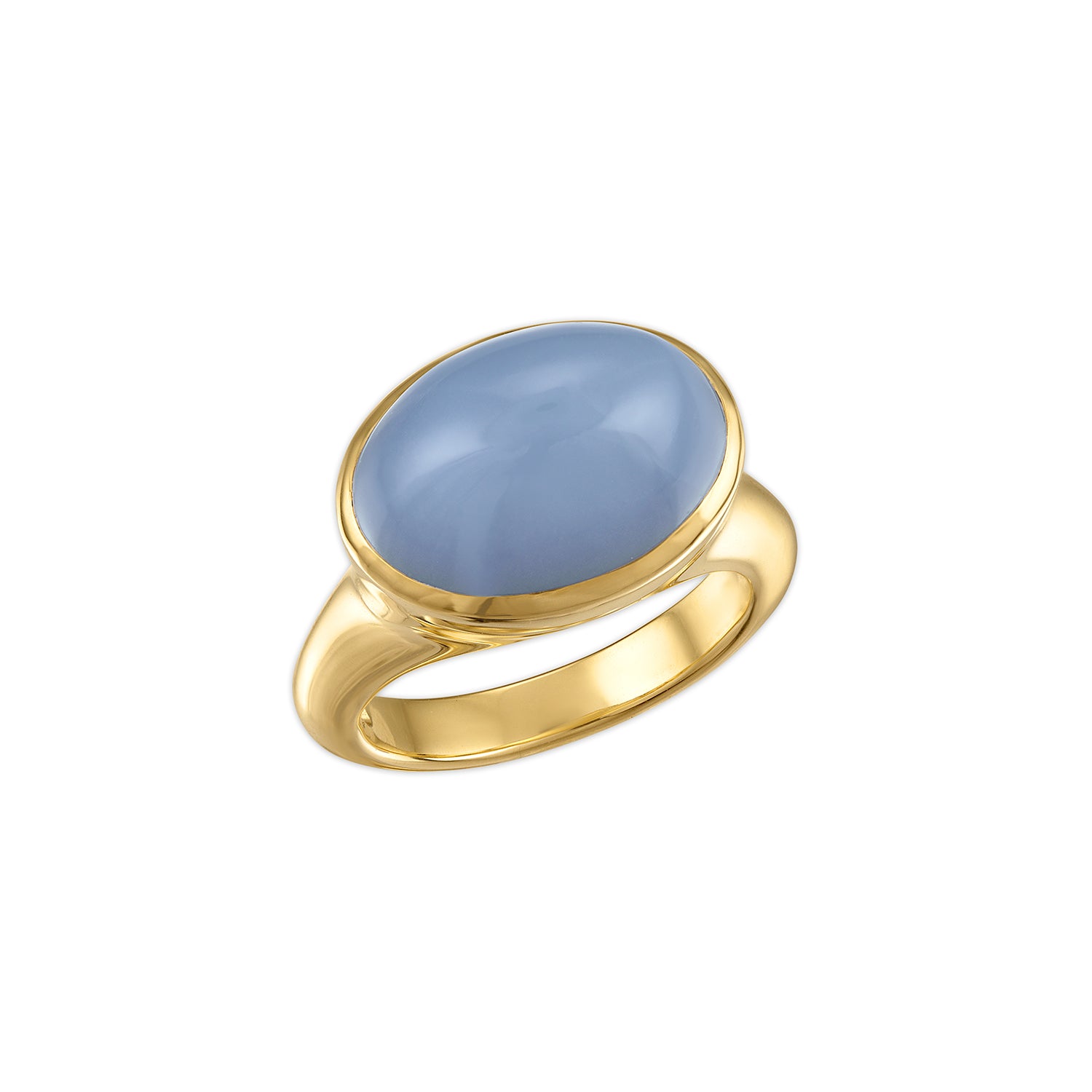 Cool-toned and quietly powerful. This Úna Ring features a 10.8-carat chalcedony cabochon—its surface a smooth, dreamy pool of pale blue or lavender depending on the light. Nestled in 18-karat yellow gold, the sculptural form plays with contrast: soft color meets solid weight, delicacy meets presence.