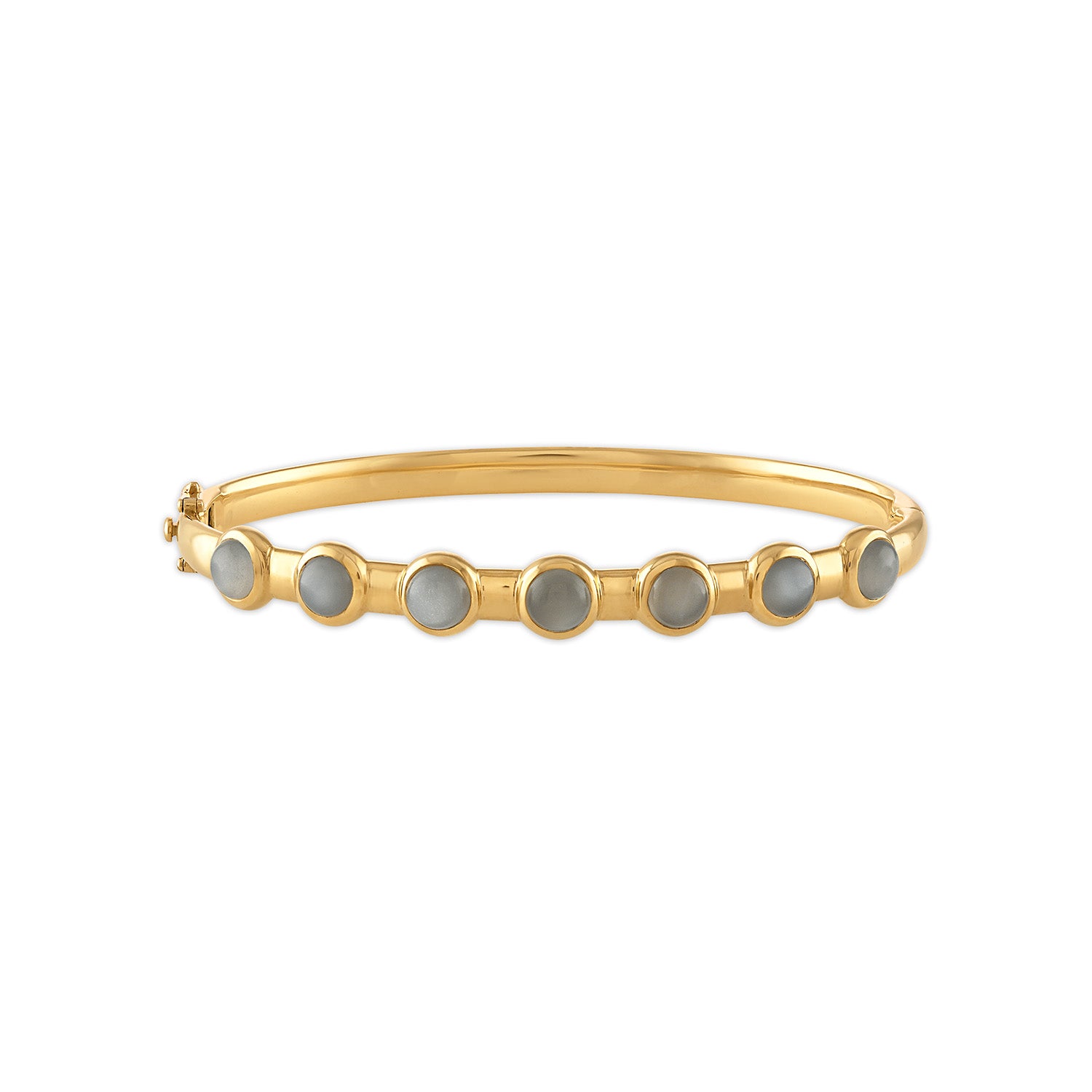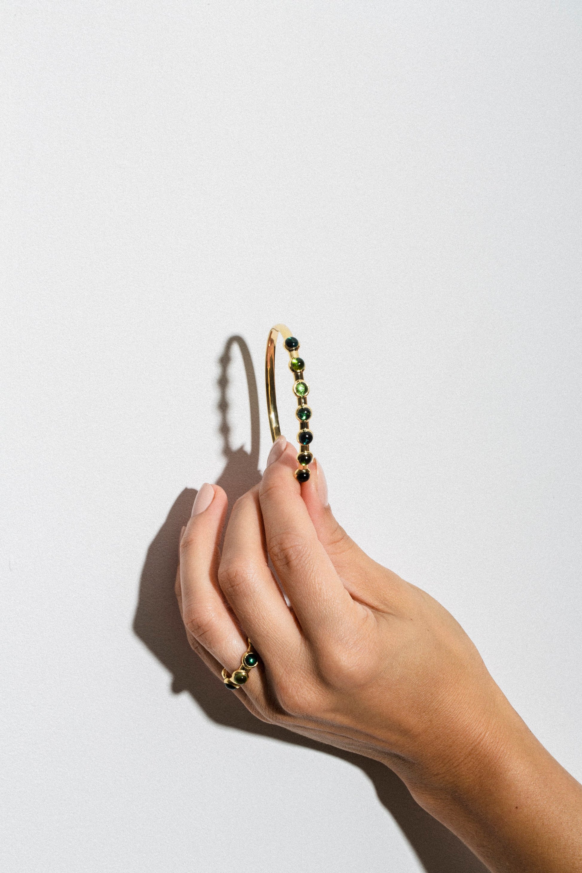 The Vic Bangle brings the signature language of the Vic Collection to the wrist—featuring seven 5mm cabochon gemstones set in pillowy bezels along a substantial 18-karat gold band. Bold yet fluid, it's designed with a seamless hinged closure for ease and elegance.