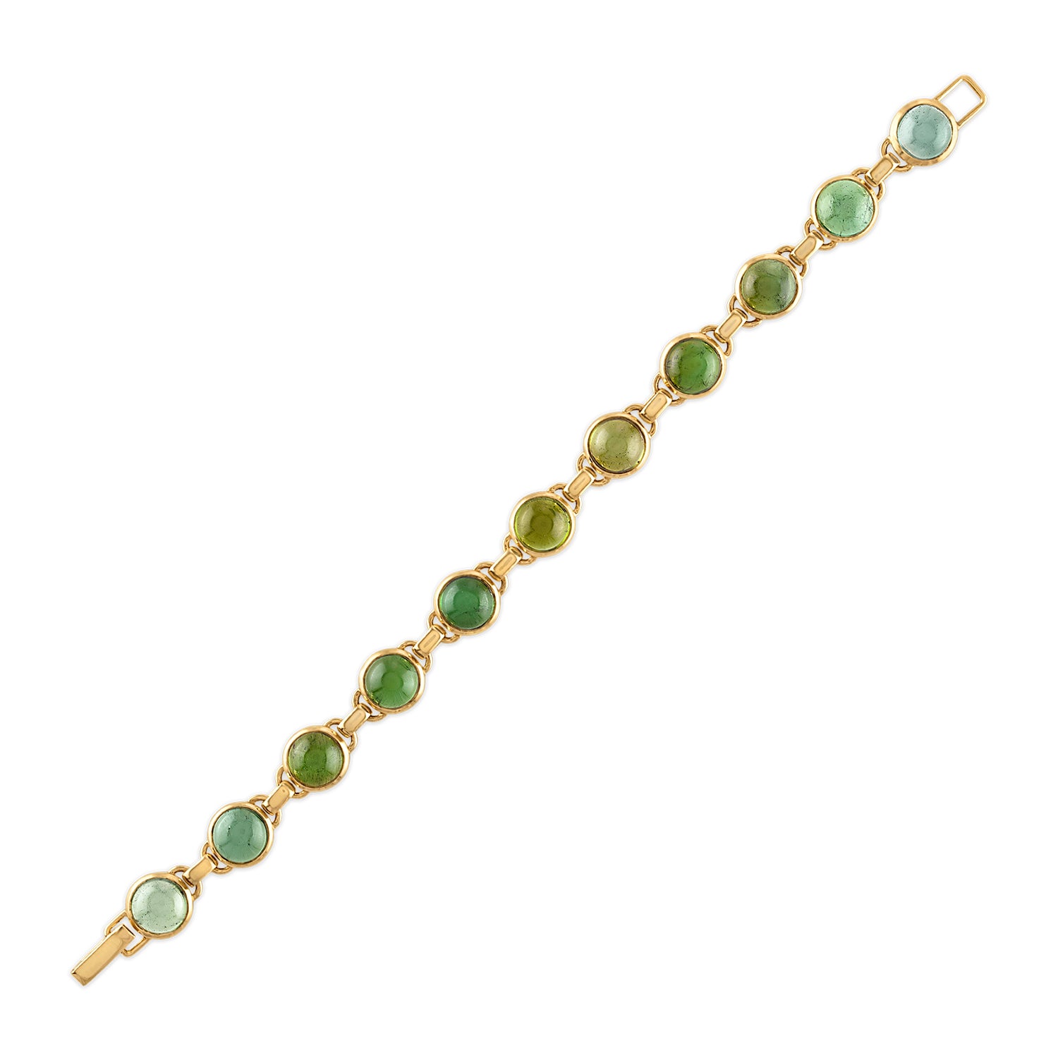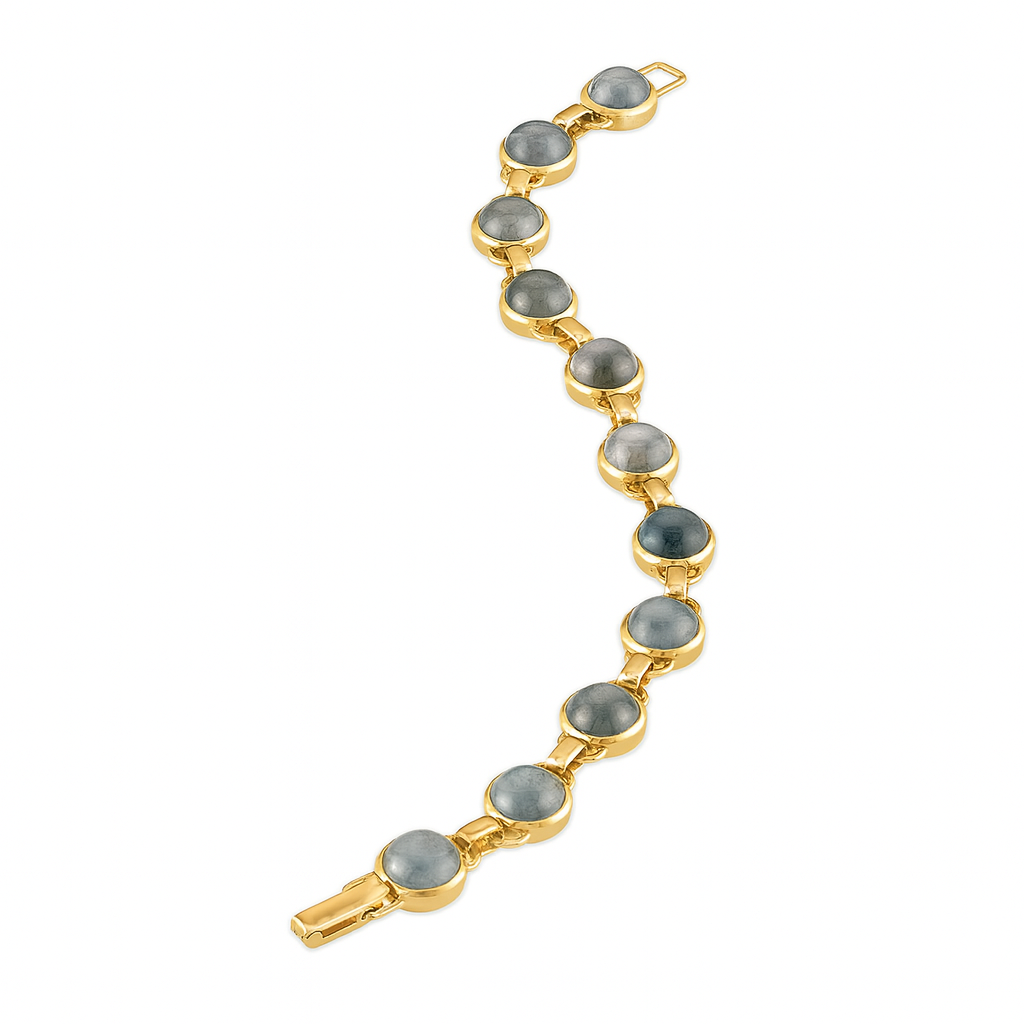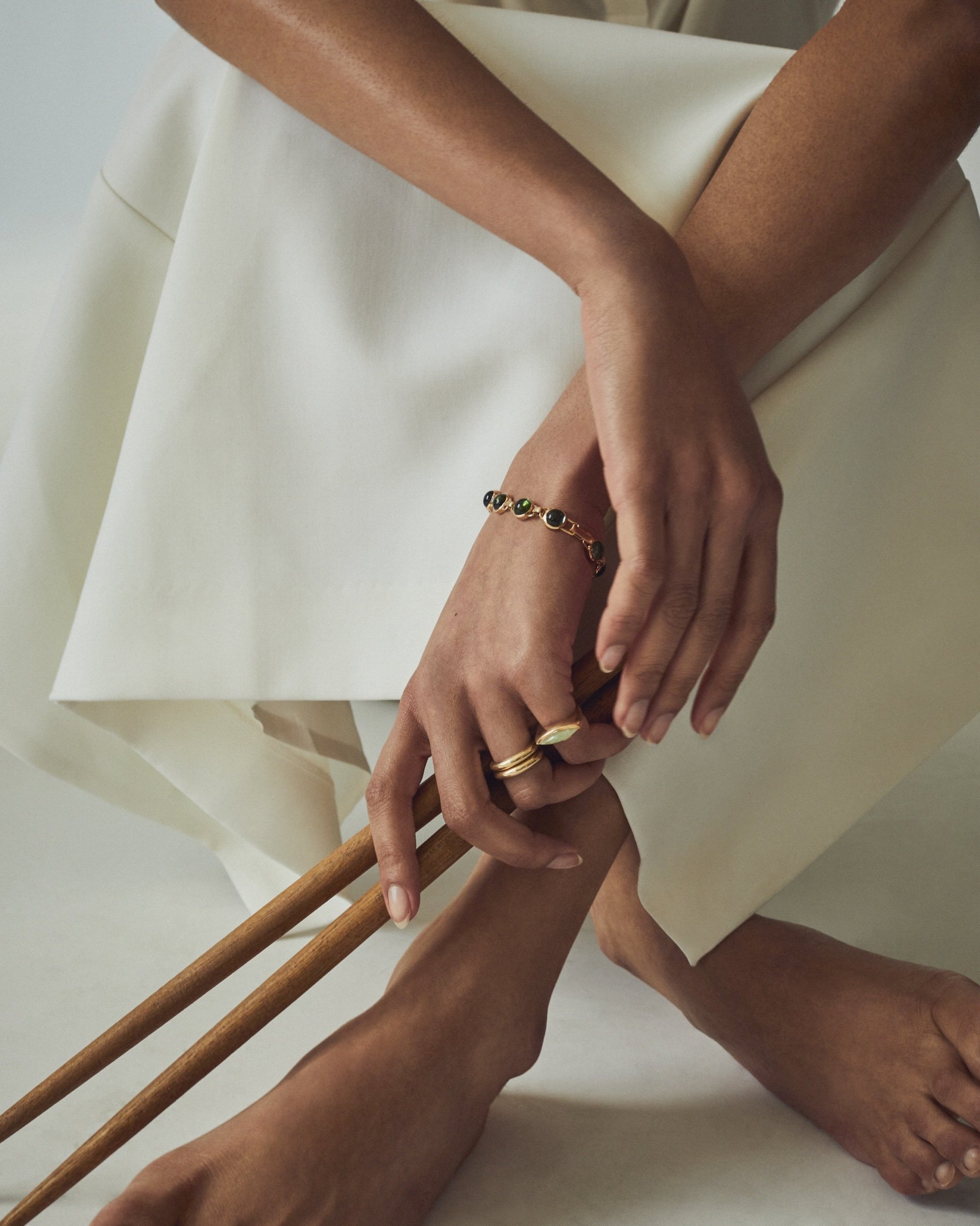 The Vic Bracelet reinterprets the graphic elegance of the Vic Collection in a bold, continuous form for the wrist. Featuring twelve 8mm cabochon gemstones bezel-set in pillowy, sculpted links of solid 18-karat yellow gold, it’s a piece that radiates quiet power.