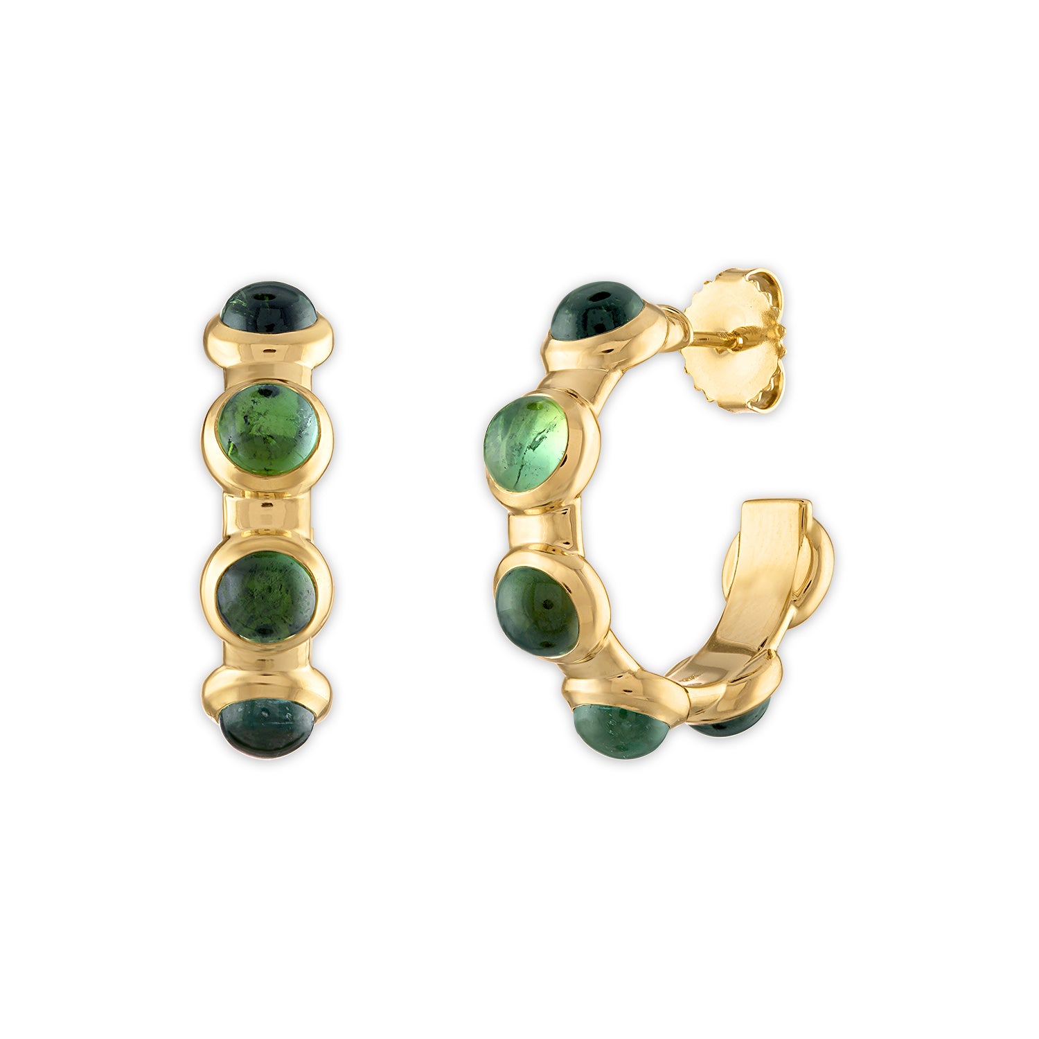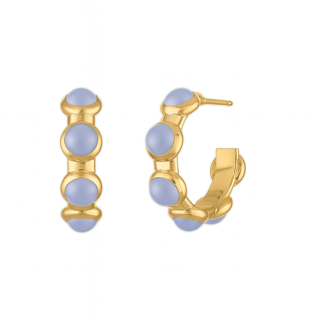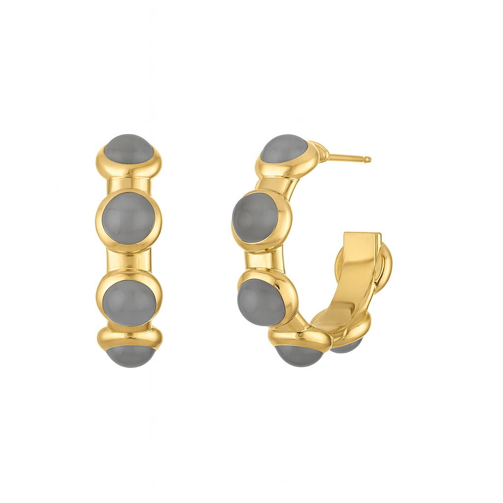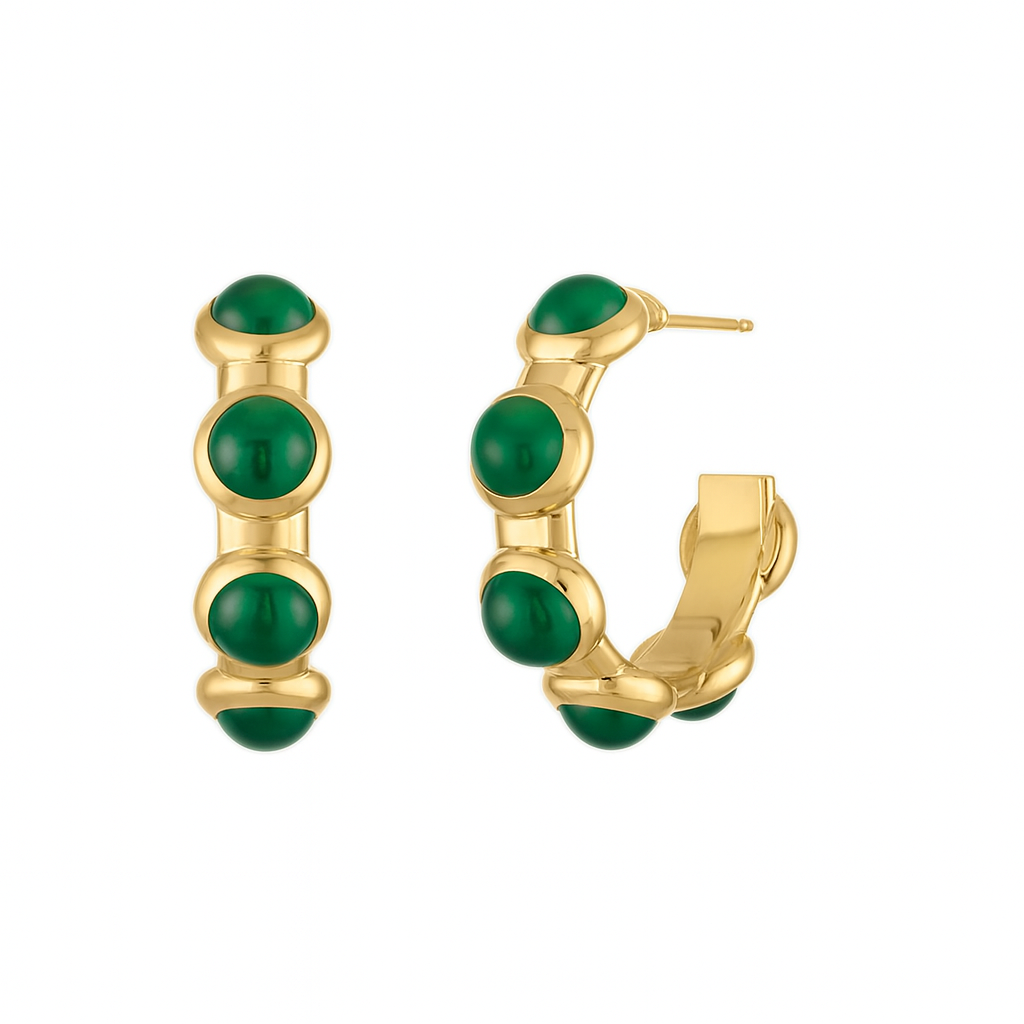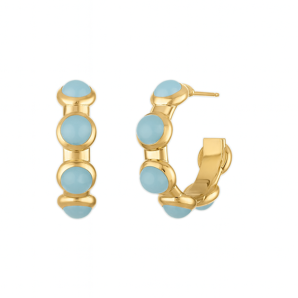 Named for Jade’s father, the Vic Hoops echo the balance of strength and softness that defines the collection. The Small Vic Hoops are cast in solid 18-karat yellow gold and adorned with twelve rounded 5mm cabochon gemstones—each one bezel-set in a pillowy silhouette that feels substantial yet refined.