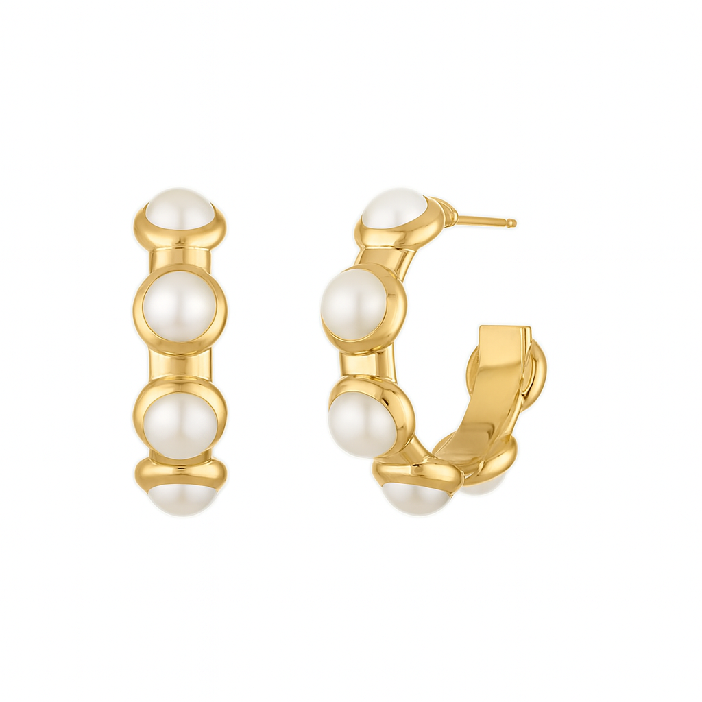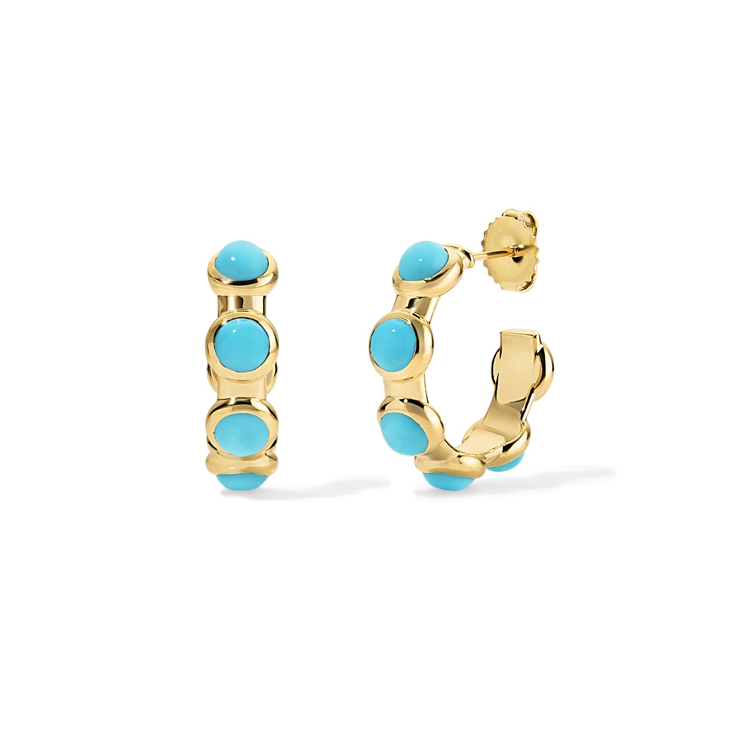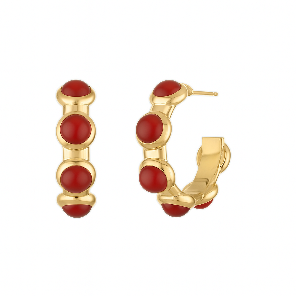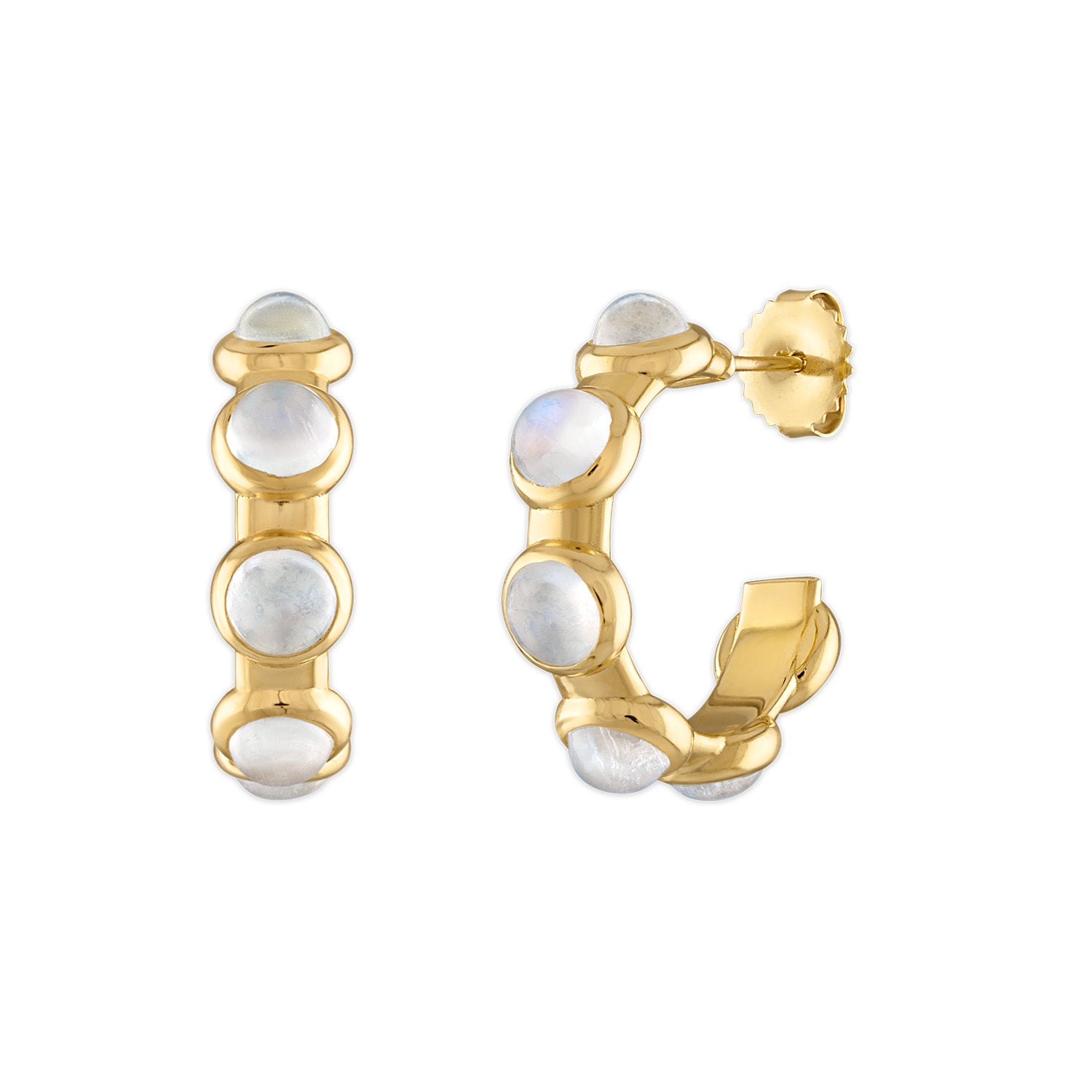 Named for Jade’s father, the Vic Hoops echo the balance of strength and softness that defines the collection. The Small Vic Hoops are cast in solid 18-karat yellow gold and adorned with twelve rounded 5mm cabochon gemstones—each one bezel-set in a pillowy silhouette that feels substantial yet refined.