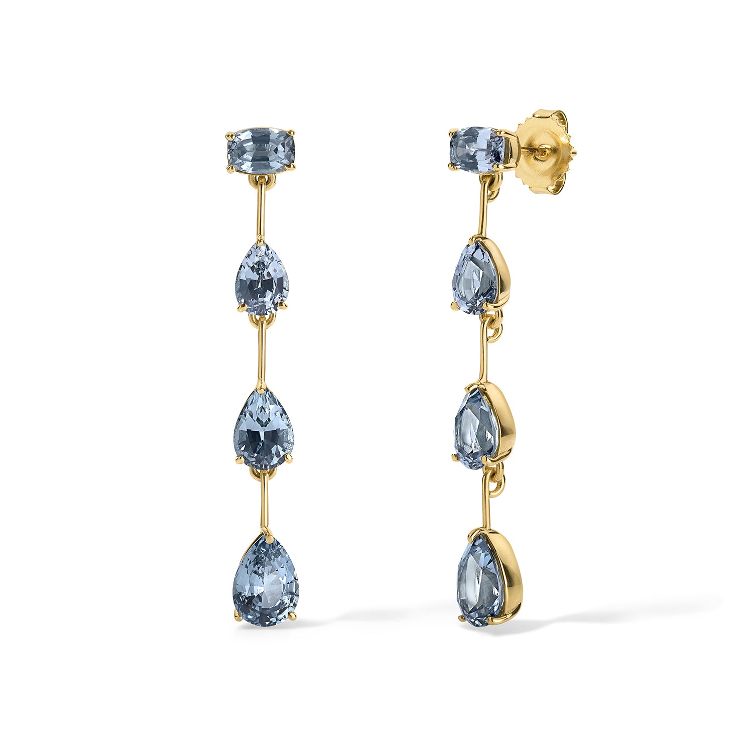 Each one-of-a-kind earring begins with a substantial cushion-cut gray spinel—chosen for its depth, softness, and tonal mystery—followed by a cascade of three graduated pear-shaped stones. Together, they create a fluid line of light and shadow that gently frames the face. Set in high-polish 18-karat yellow gold, the Vivienne Earrings hold elegance in every angle and movement.